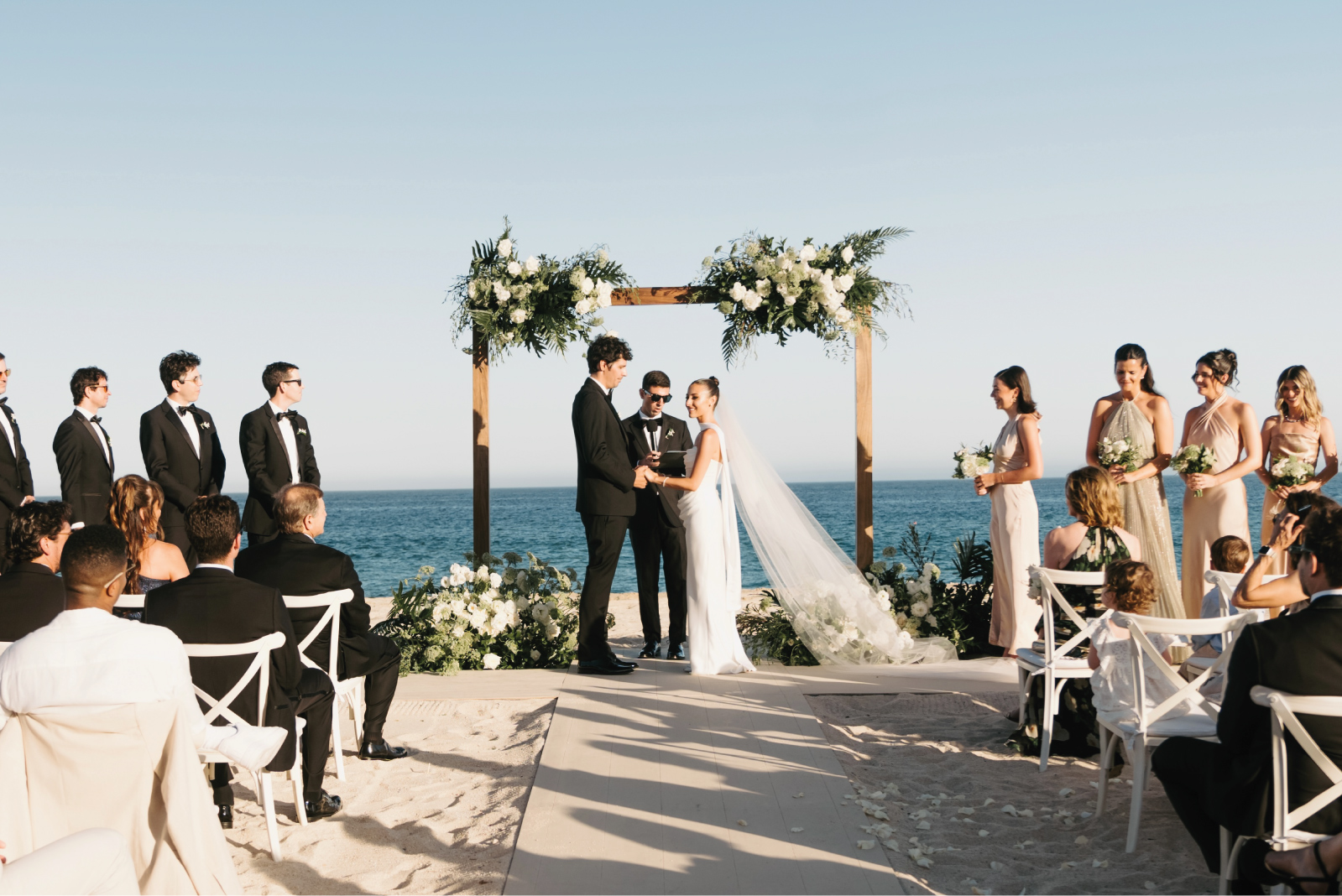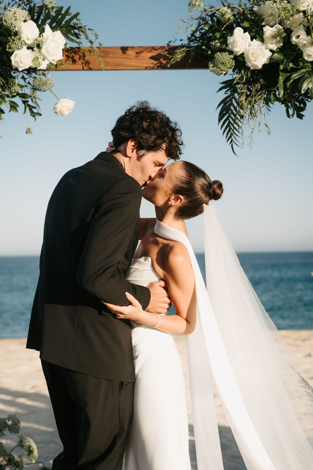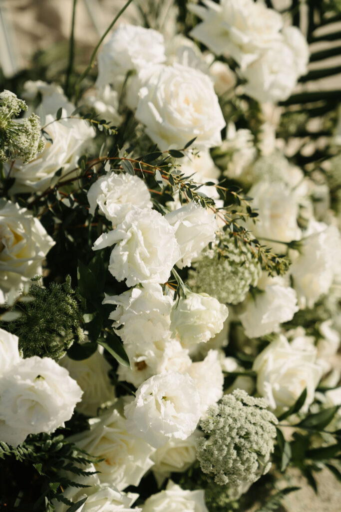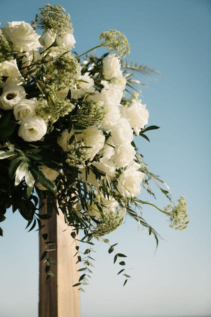 The ceremony overlooked the ocean, framed by an arch of white roses, lisianthus, and soft greenery swaying in the breeze. With the sound of the waves and their loved ones surrounding them, the moment became more than a ceremony—it became a feeling.