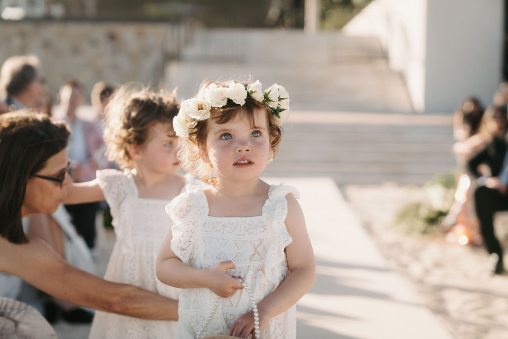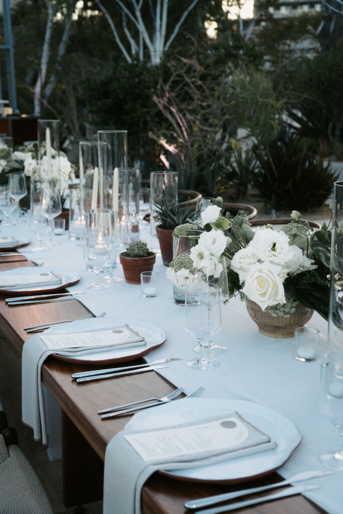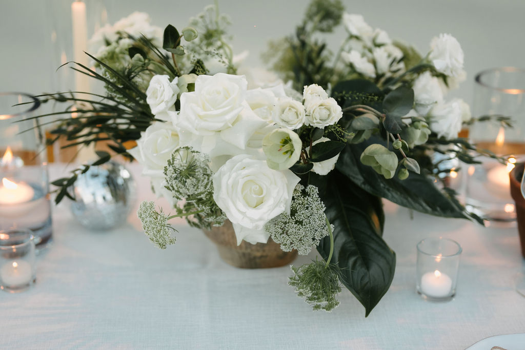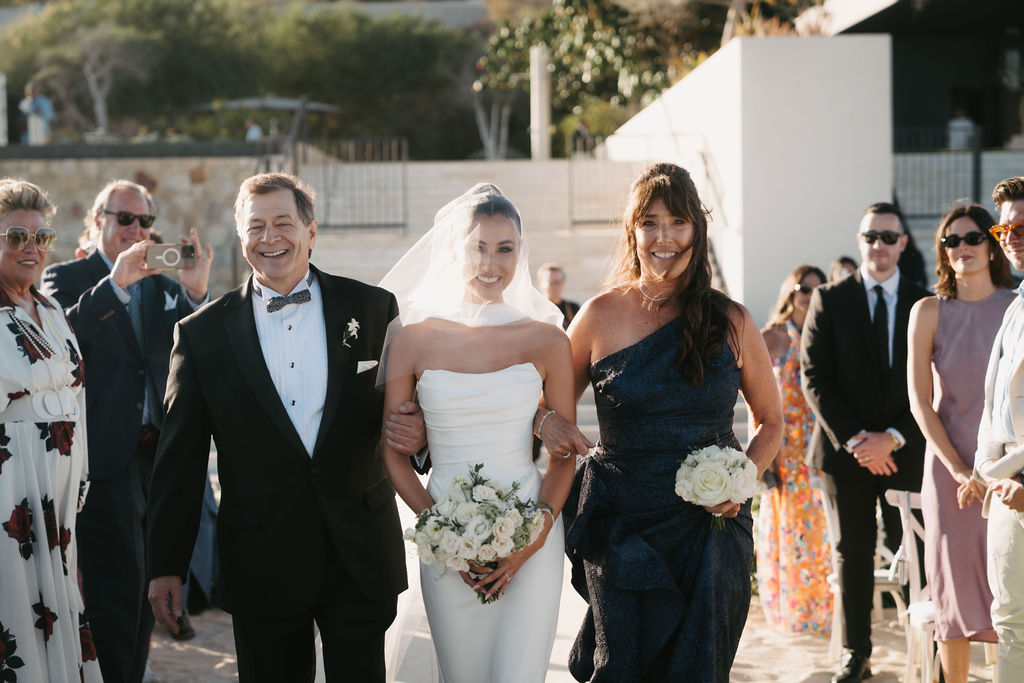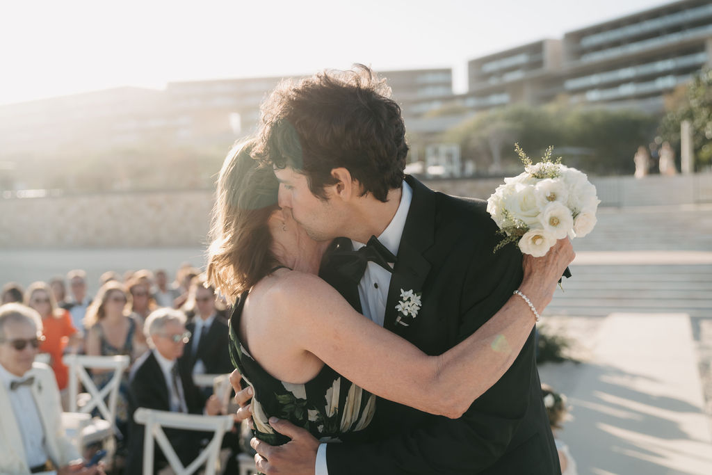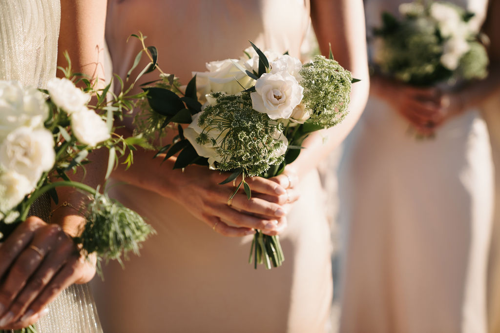 The ceremony overlooked the ocean, framed by an arch of white roses, lisianthus, and soft greenery swaying in the breeze. With the sound of the waves and their loved ones surrounding them, the moment became more than a ceremony—it became a feeling.
