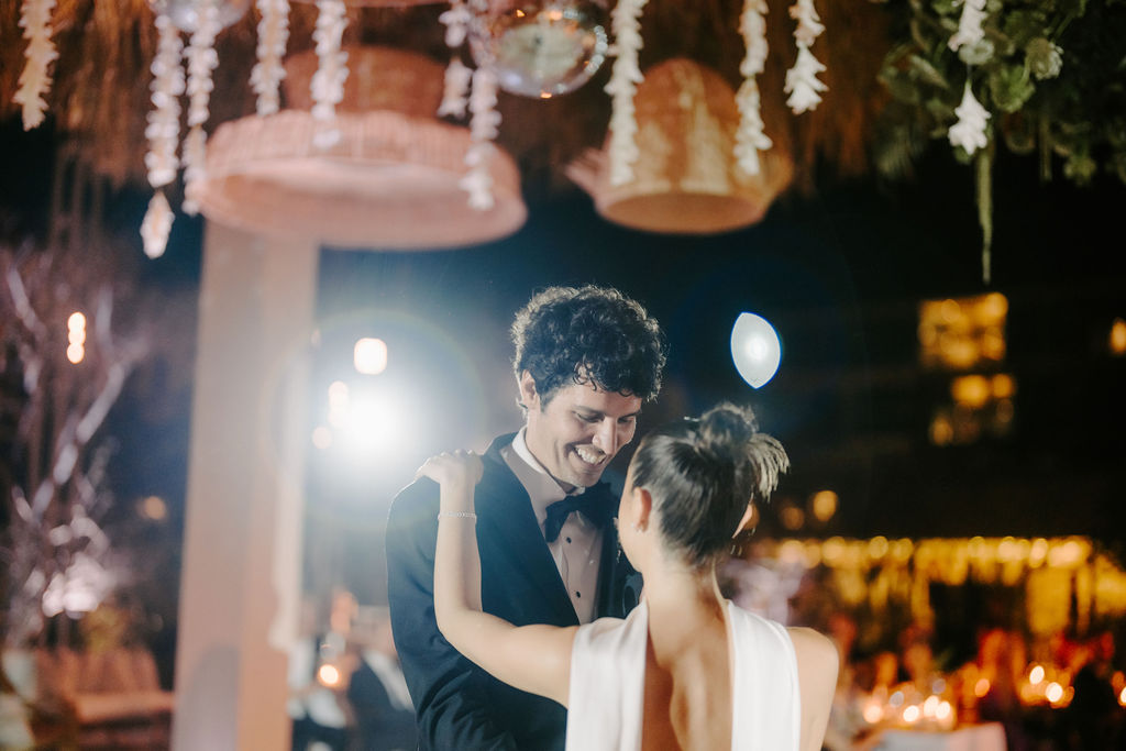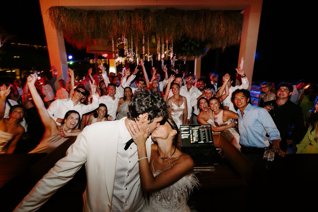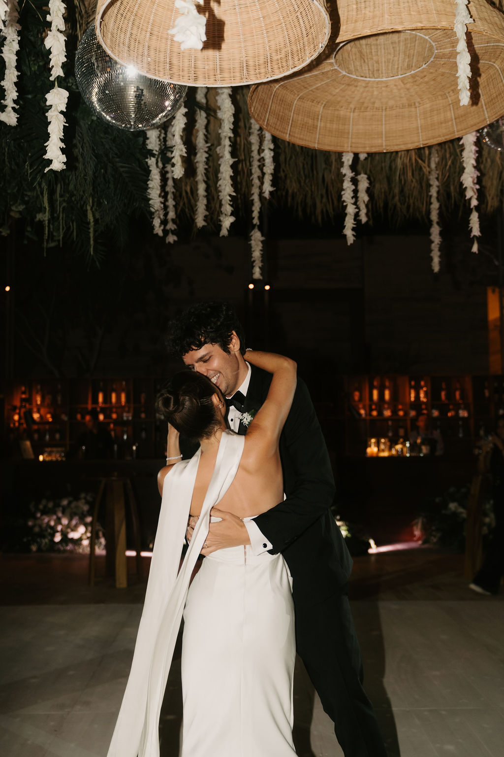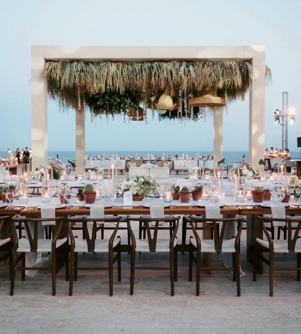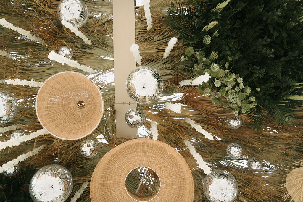 As the sun dipped into the sea, the celebration shifted into a night of pure magic. Parota tables glowed with candlelight, soft linens, and floral compositions that embodied their modern taste — refined, organic, and full of character. Above, a custom wooden structure layered with palms, disco balls, and cascading florals set the stage for what was coming next—the party of the year.