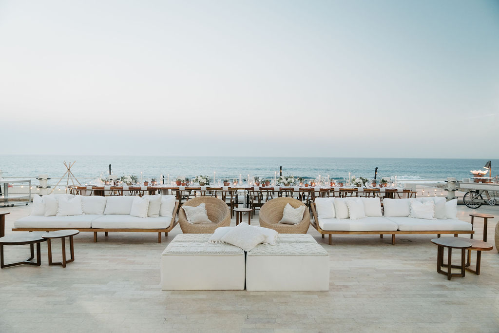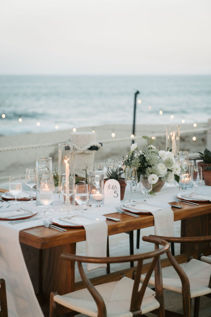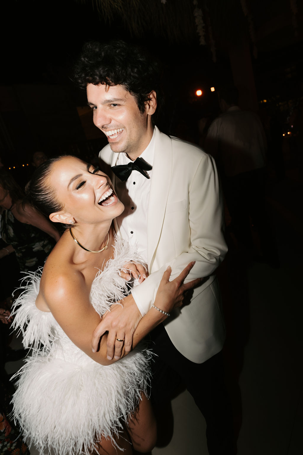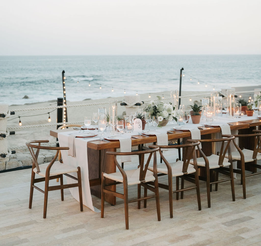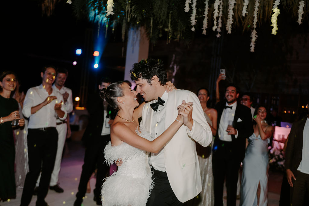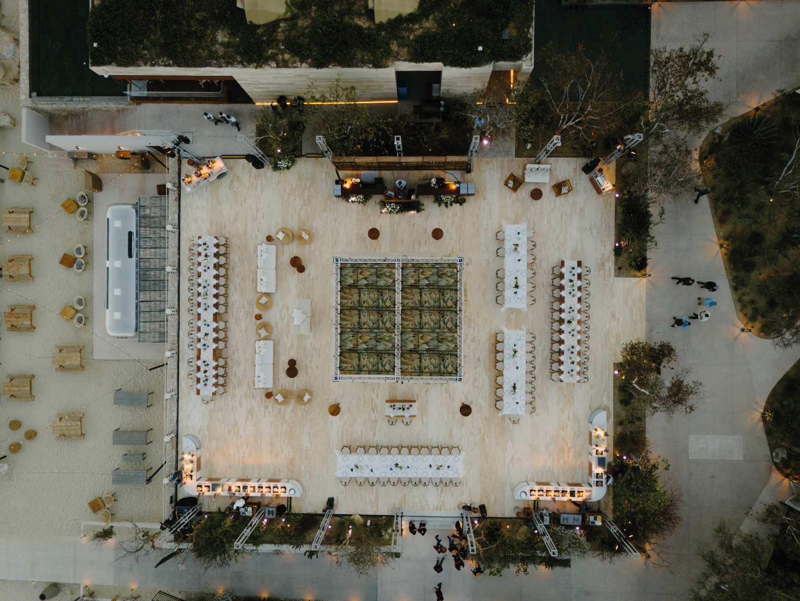 As the sun dipped into the sea, the celebration shifted into a night of pure magic. Parota tables glowed with candlelight, soft linens, and floral compositions that embodied their modern taste — refined, organic, and full of character. Above, a custom wooden structure layered with palms, disco balls, and cascading florals set the stage for what was coming next—the party of the year.