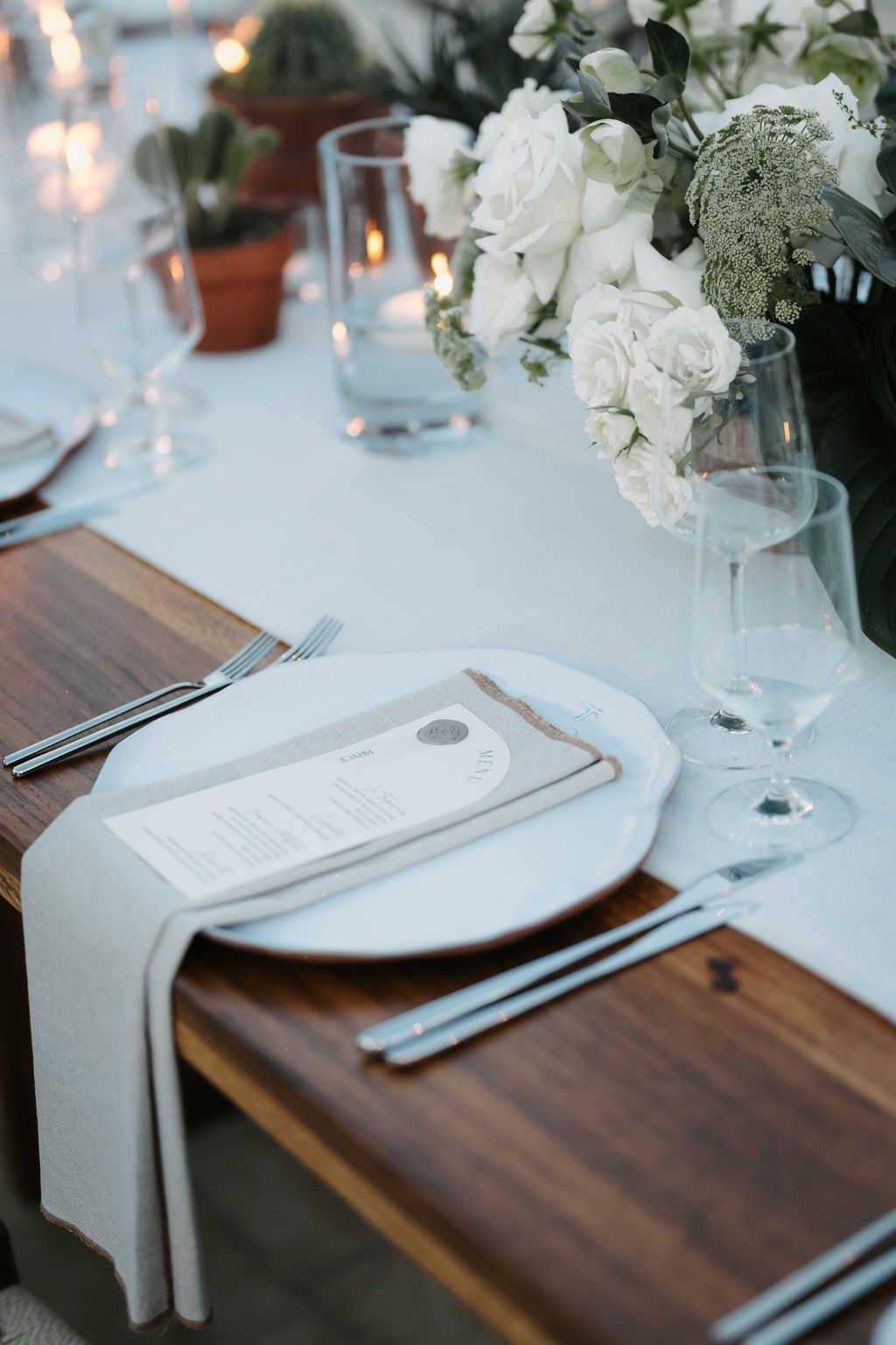 As the sun dipped into the sea, the celebration shifted into a night of pure magic. Parota tables glowed with candlelight, soft linens, and floral compositions that embodied their modern taste — refined, organic, and full of character. Above, a custom wooden structure layered with palms, disco balls, and cascading florals set the stage for what was coming next—the party of the year.