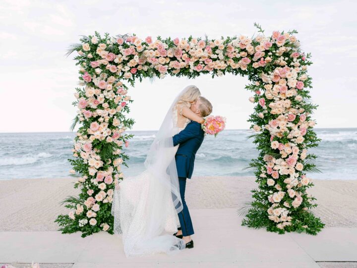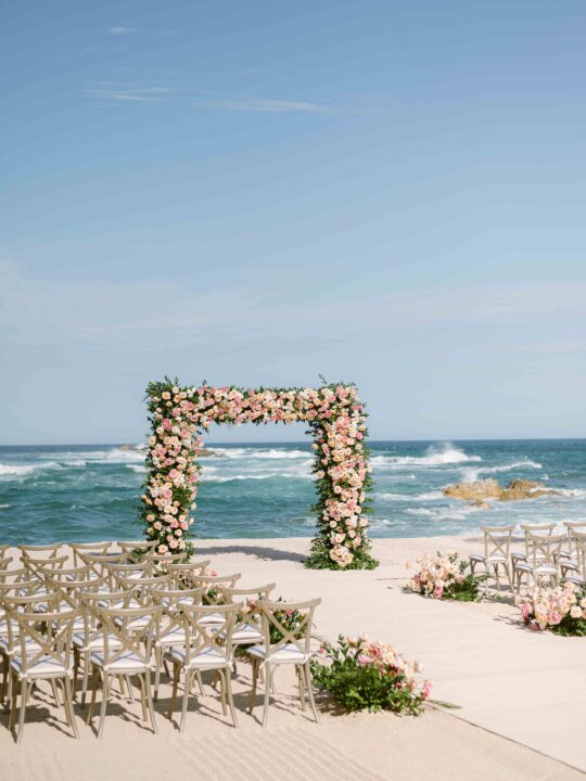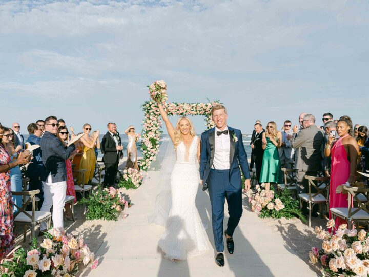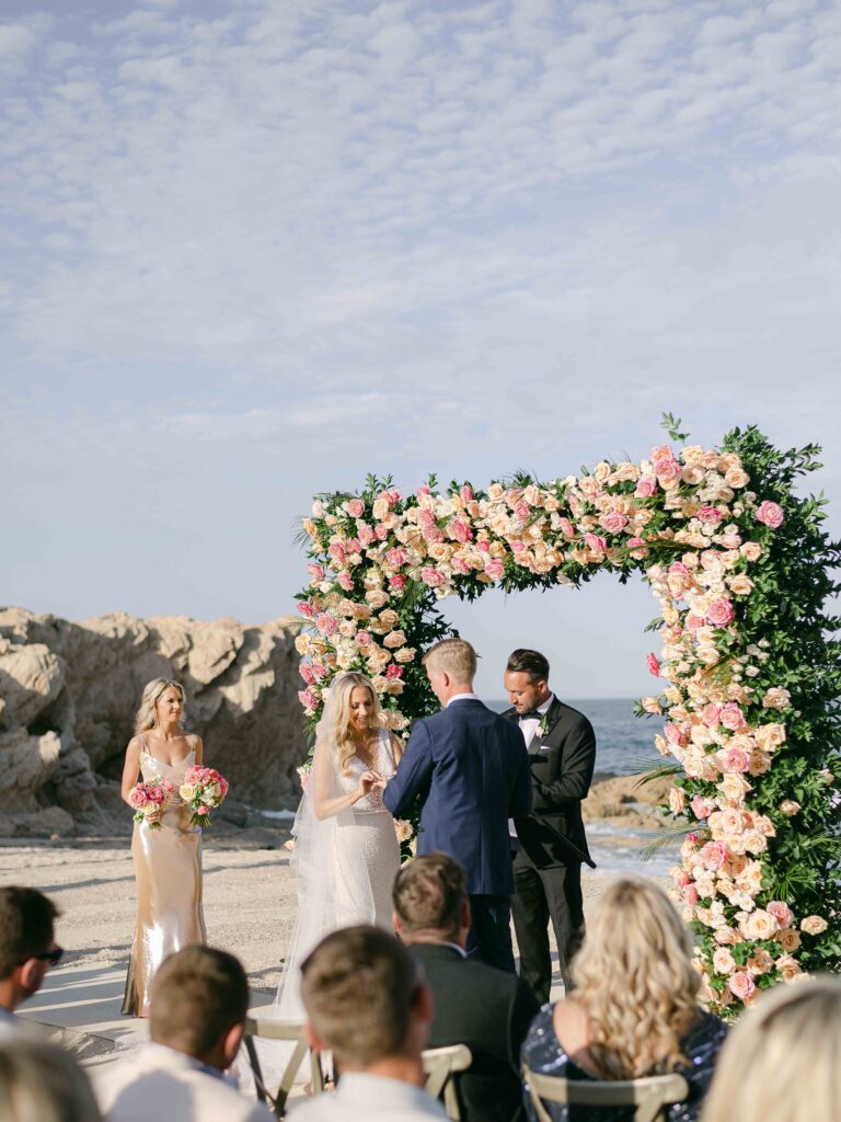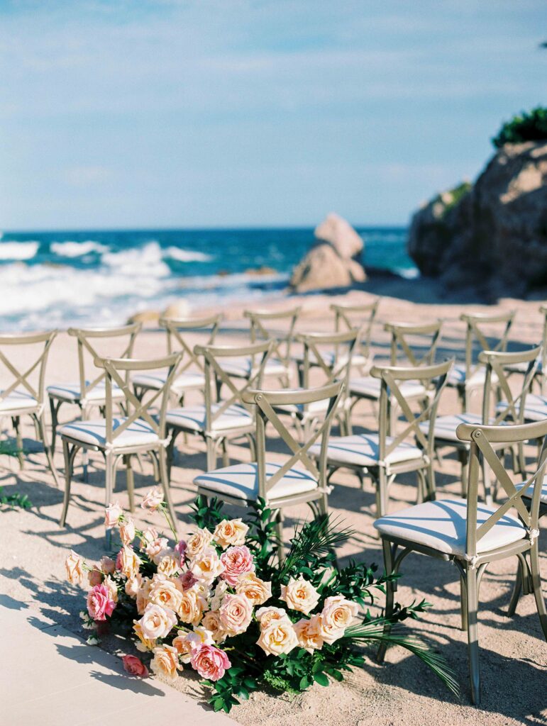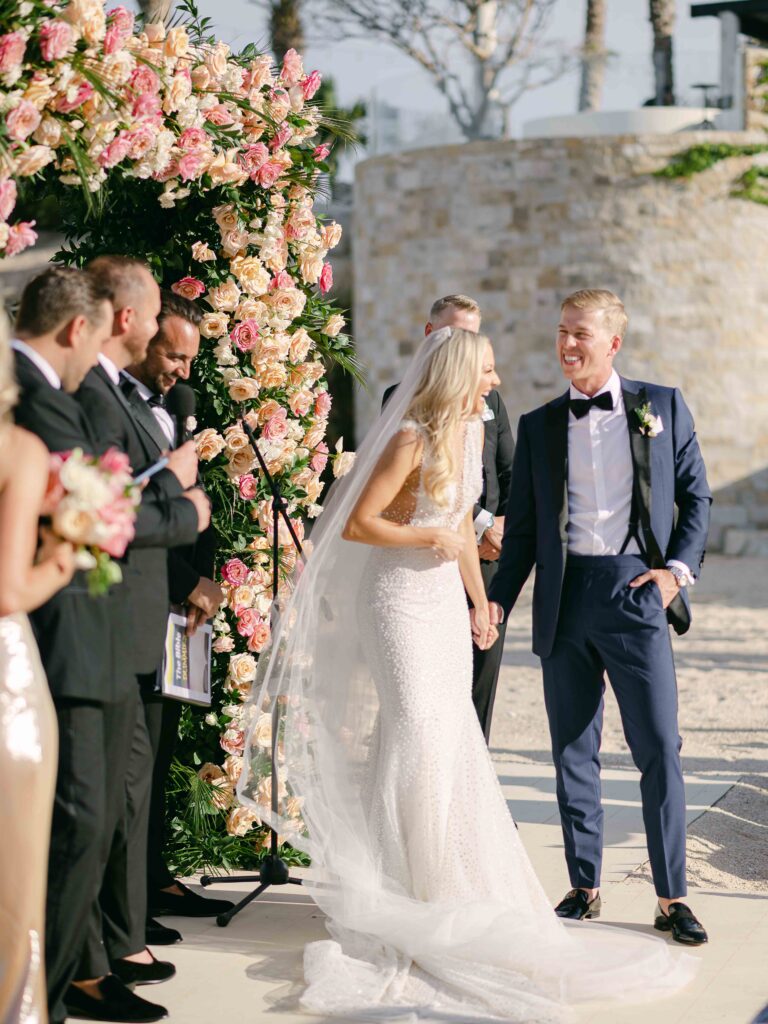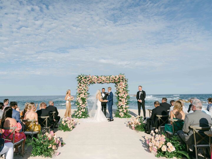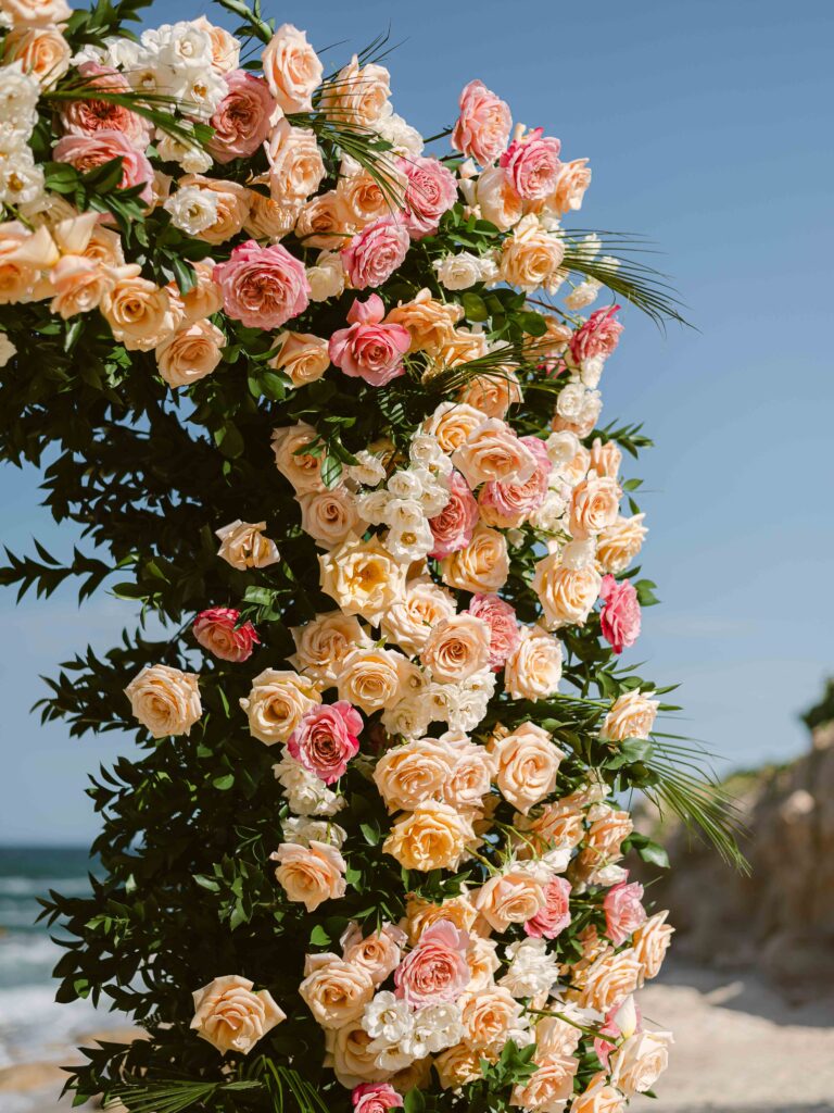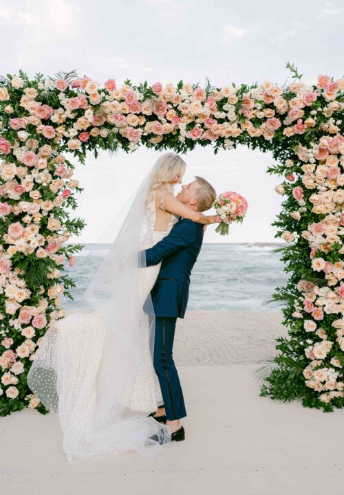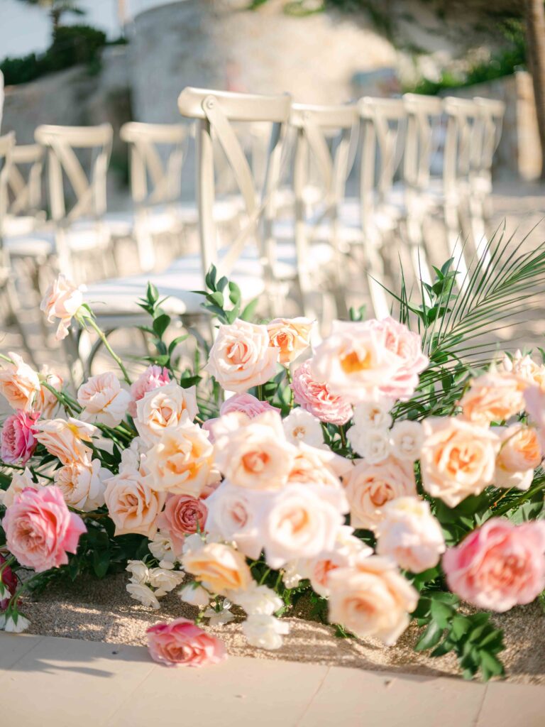 Overlooking the sea, Ashlee & Clint exchanged vows beneath a romantic arch of roses and lisianthus in soft blush and peach tones, with an aisle lined to match. The bouquets were especially beautiful, romantic, and perfectly tied into the overall design.