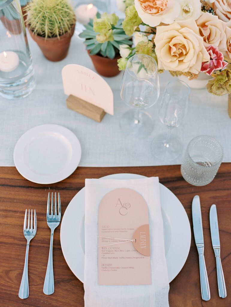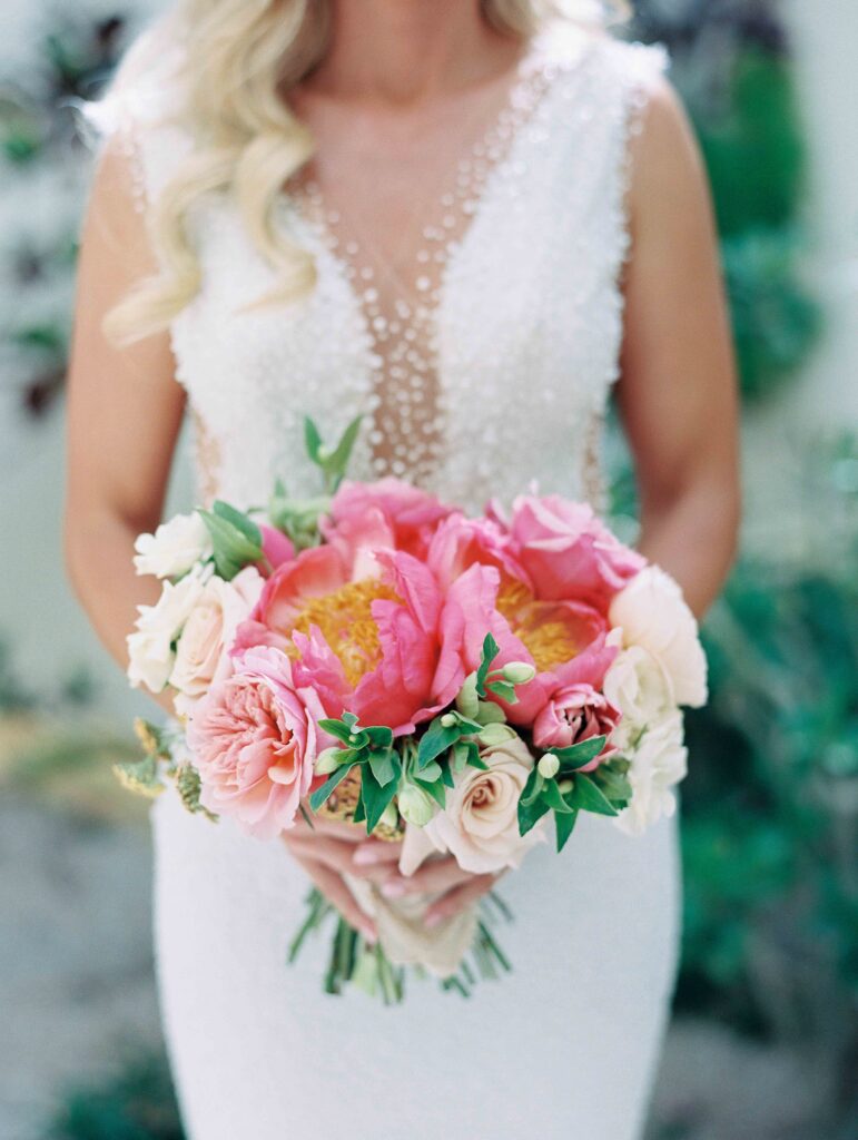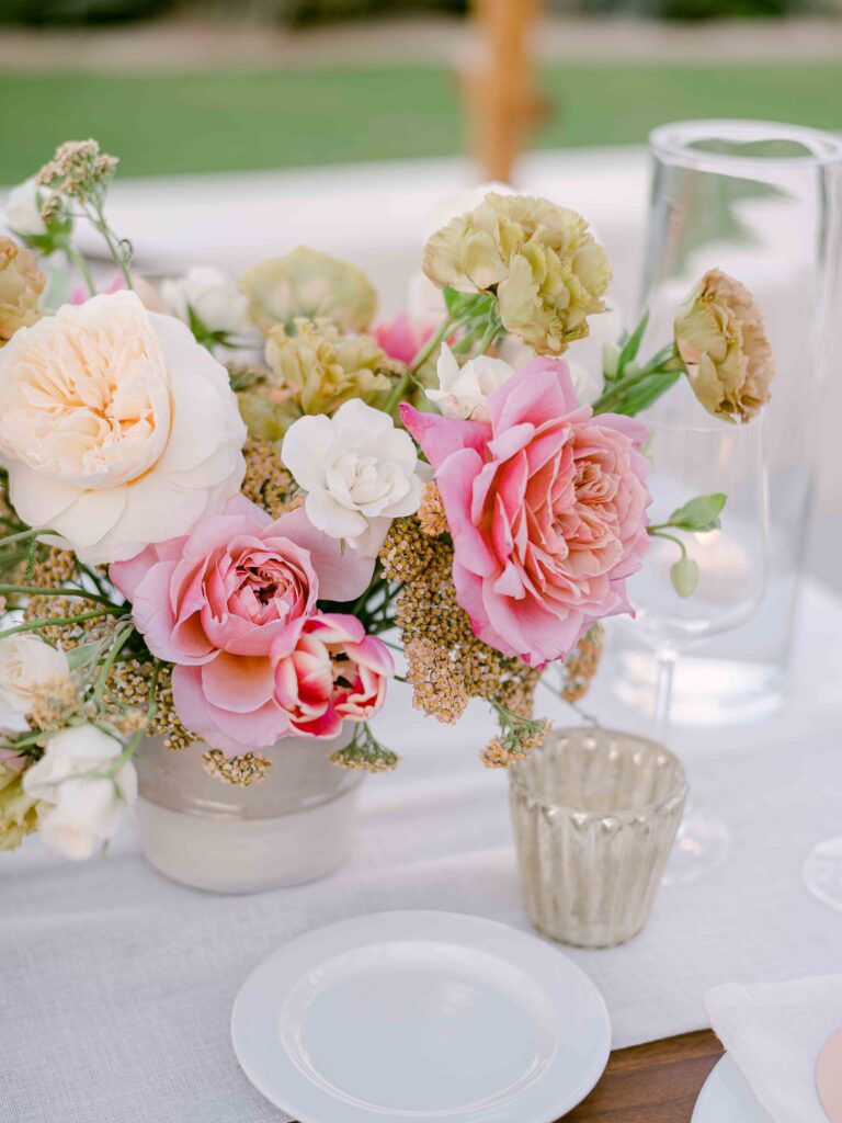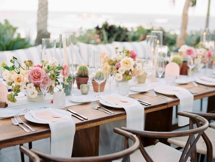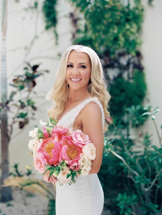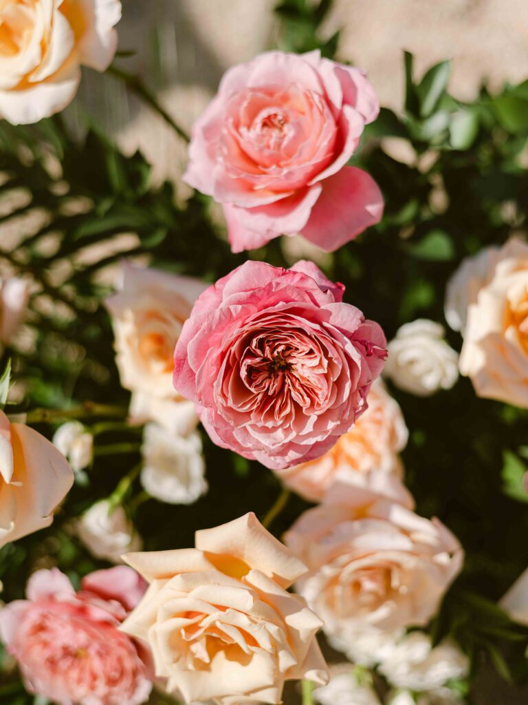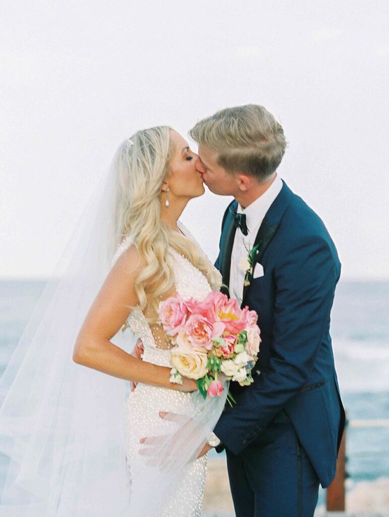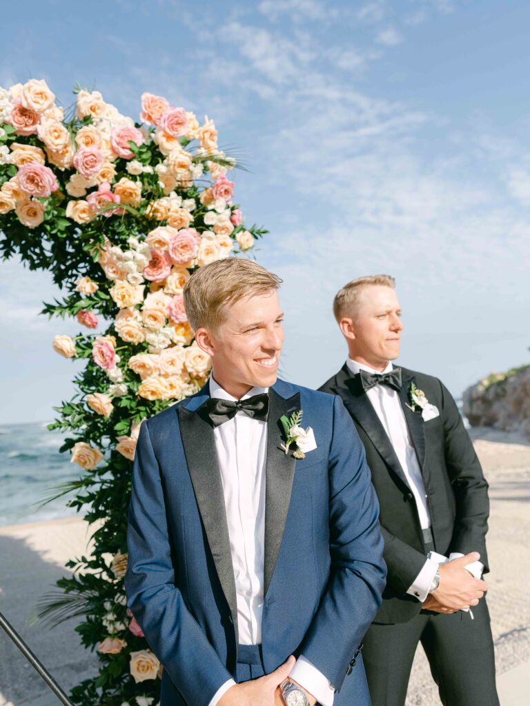 Overlooking the sea, Ashlee & Clint exchanged vows beneath a romantic arch of roses and lisianthus in soft blush and peach tones, with an aisle lined to match. The bouquets were especially beautiful, romantic, and perfectly tied into the overall design.