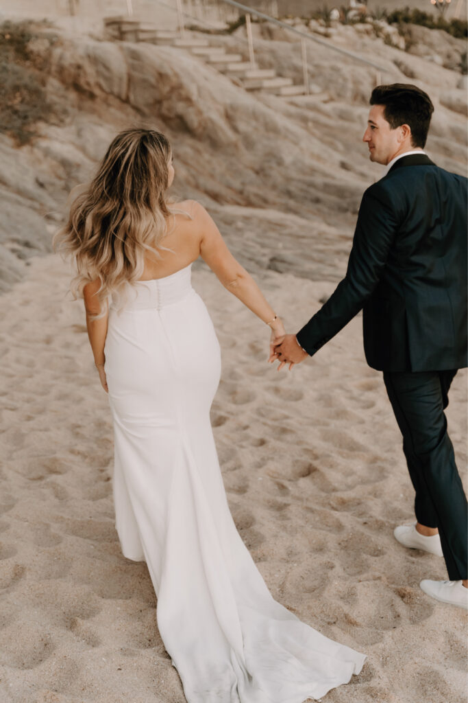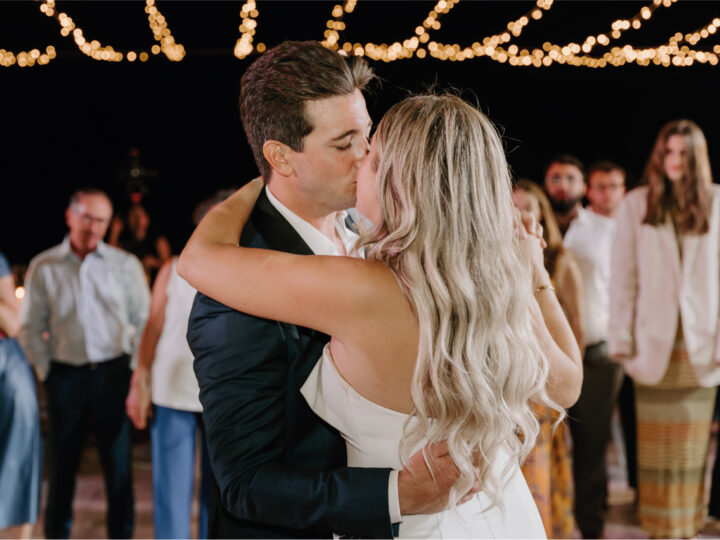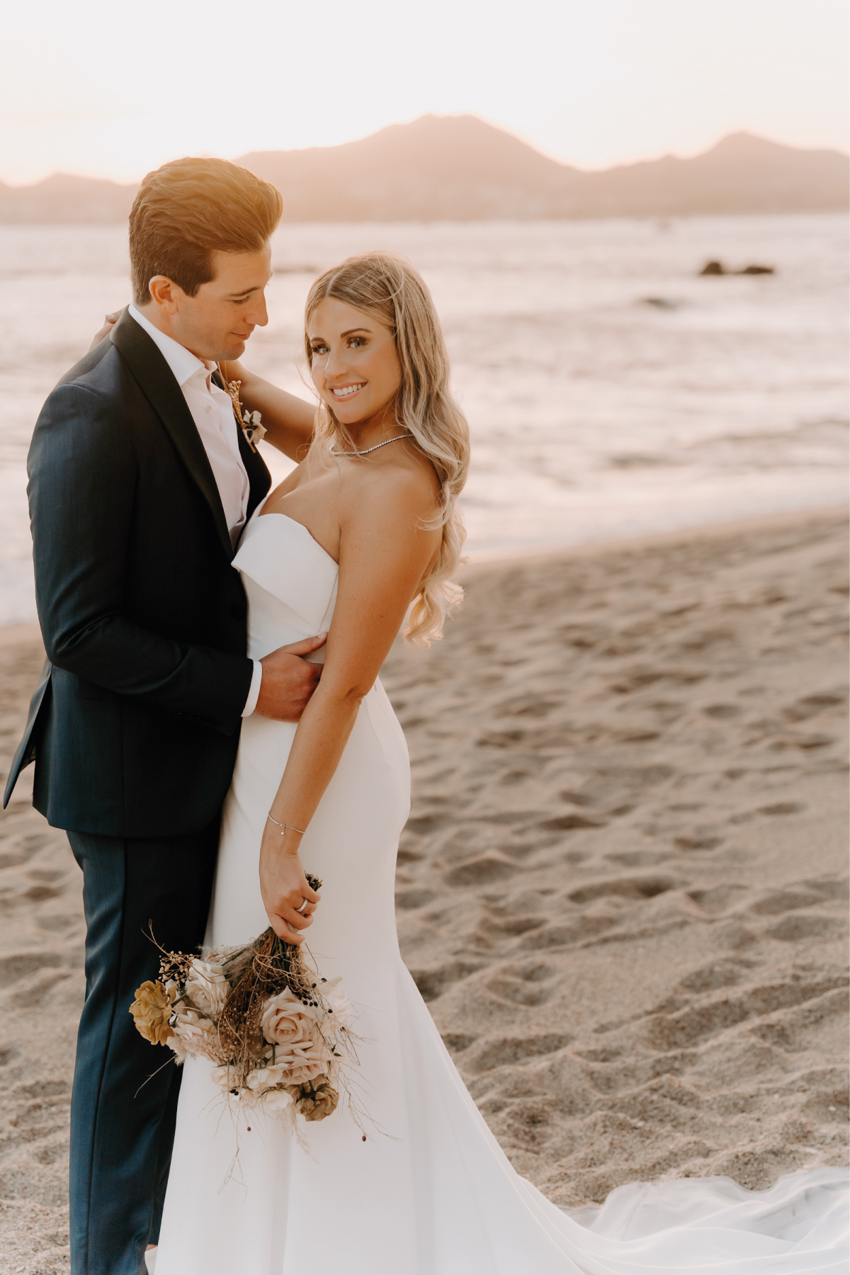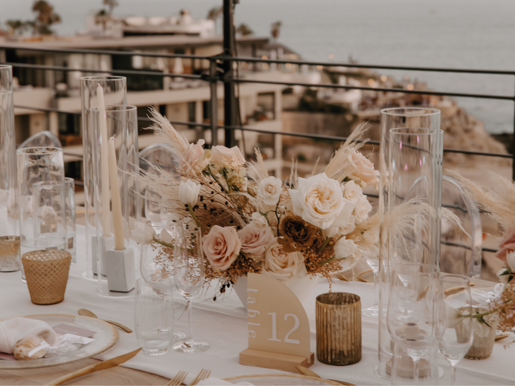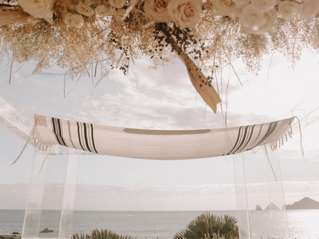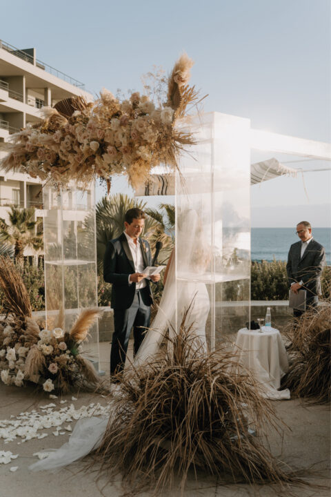 With the stunning backdrop of Cabo’s iconic coastline, the ceremony took place oceanside under a romantic chuppah adorned with soft blush-toned blooms and pampas grass. The palette was dreamy and organic, perfectly complementing the natural beauty of the setting while adding a sense of refined elegance.