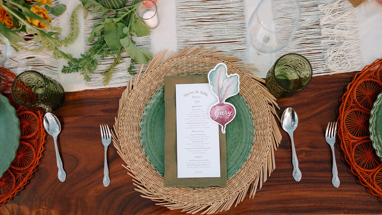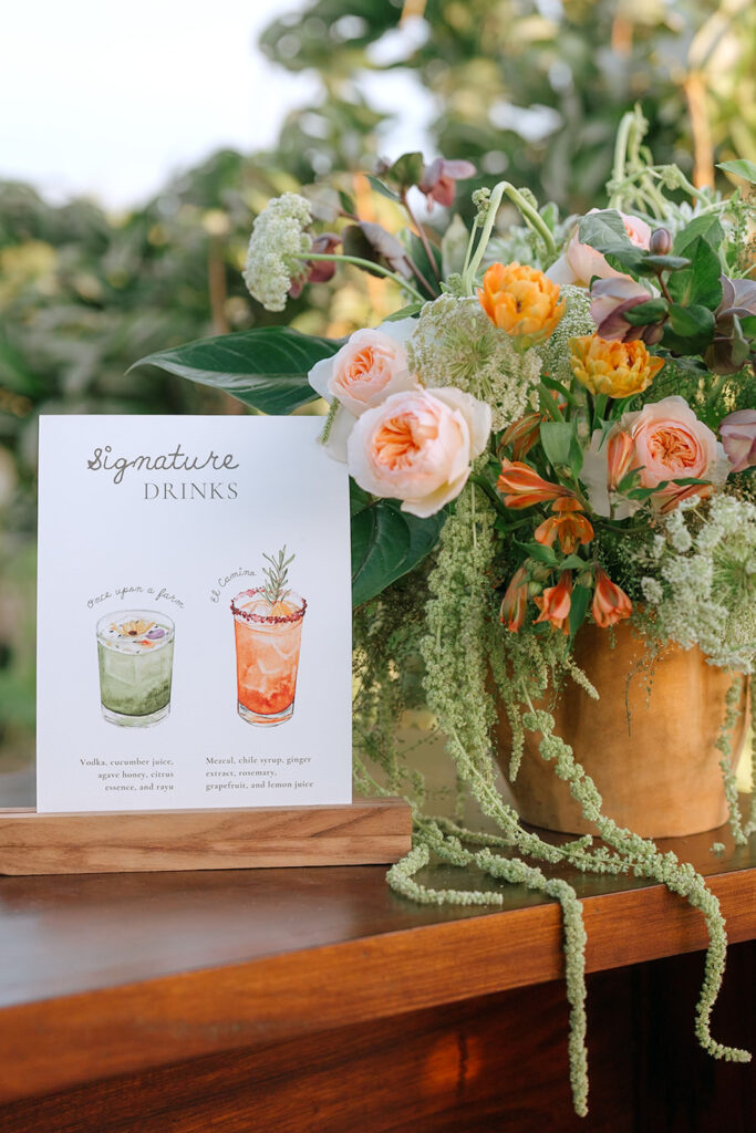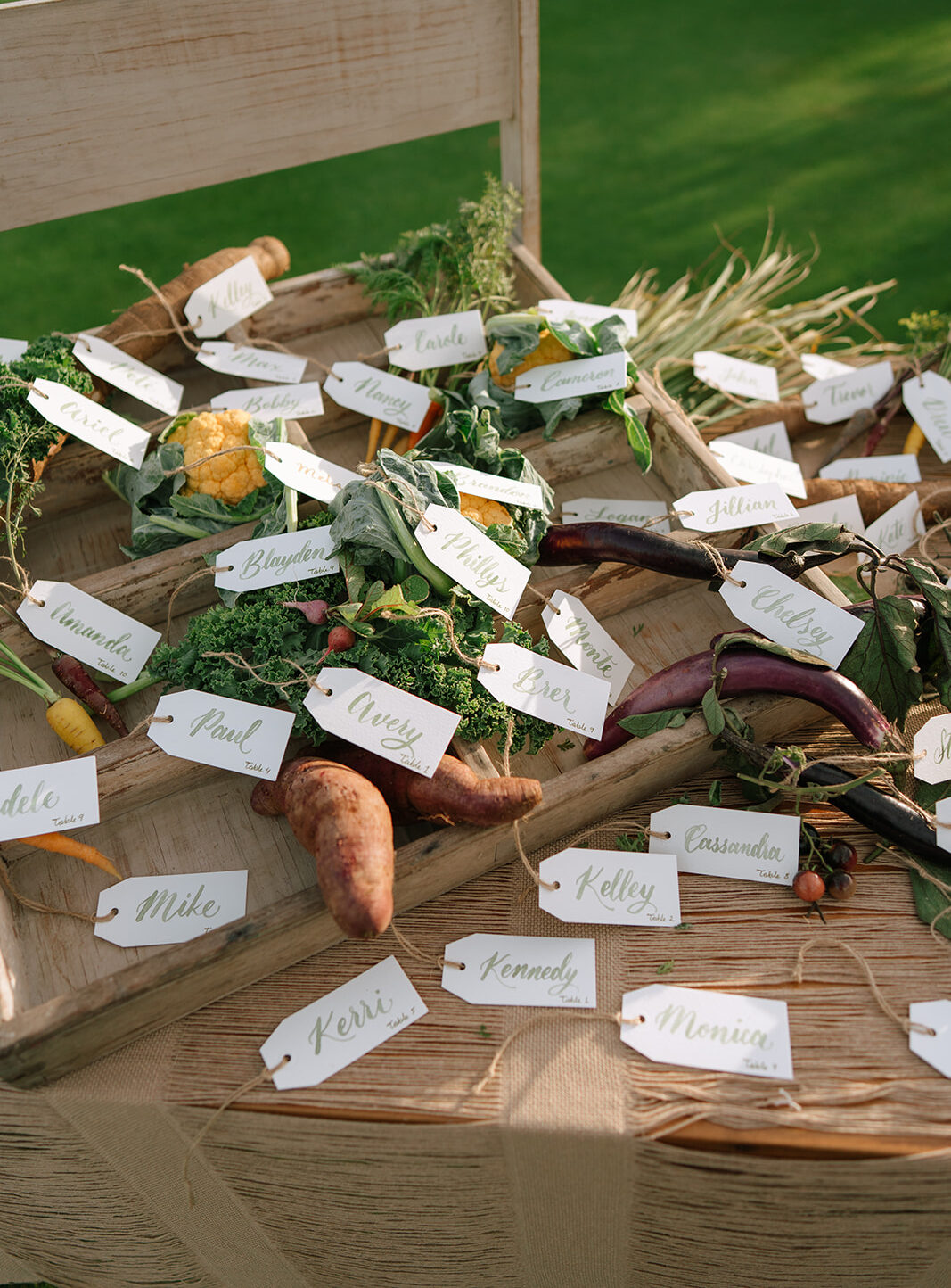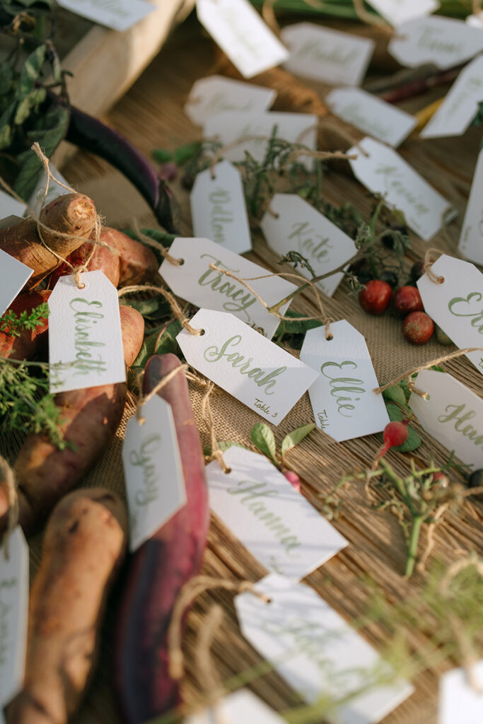 Even the seating chart became a moment: real vegetables on a rustic board, names scattered playfully among them. A thoughtful farm-to-table nod that felt fresh, surprising, and still incredibly elegant.