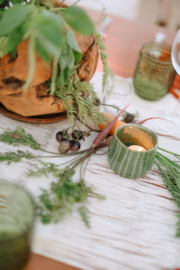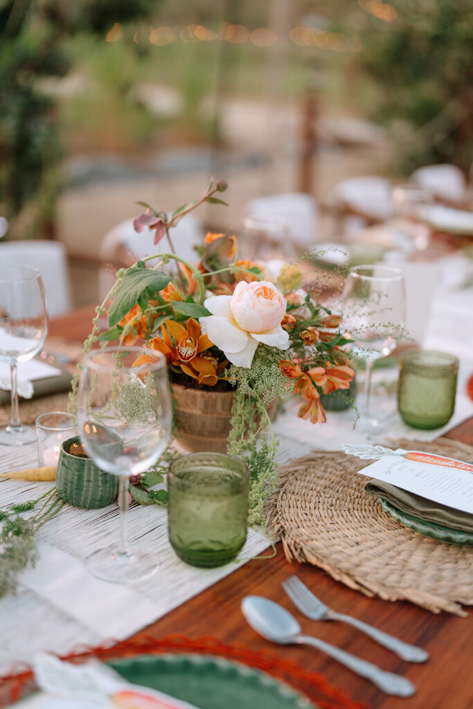 El Huerto is one of them. From the very beginning, we knew this rehearsal dinner would feel special: a design that embraced the farm-to-table soul of the space while keeping the effortless elegance that defines our work. A perfect balance between natural and refined.