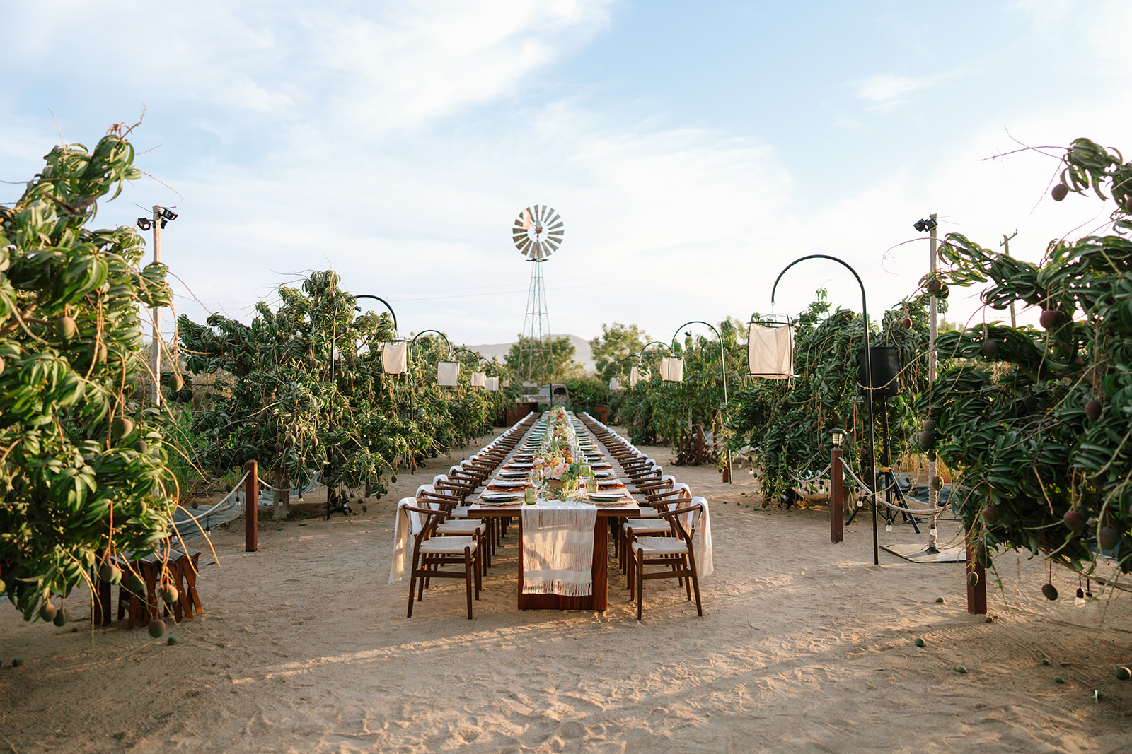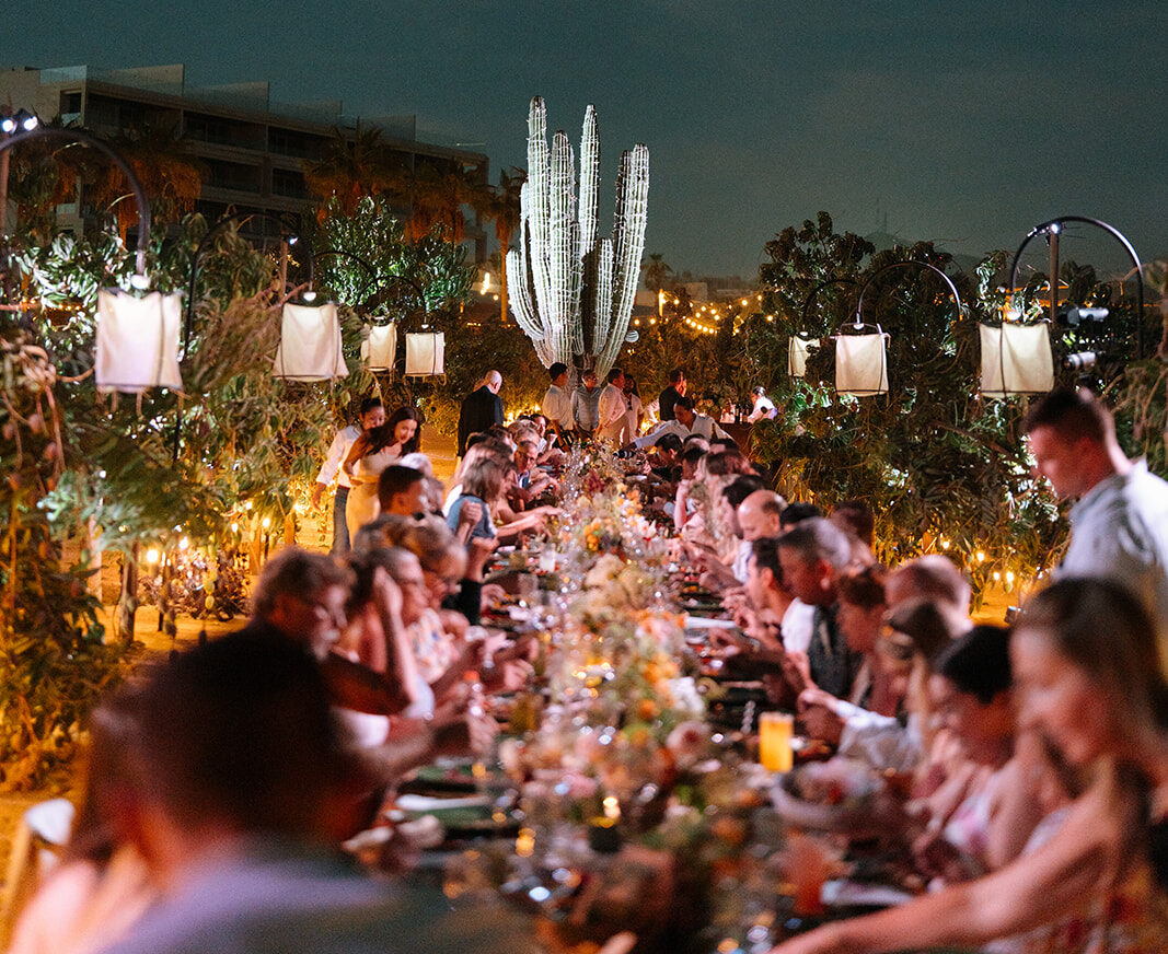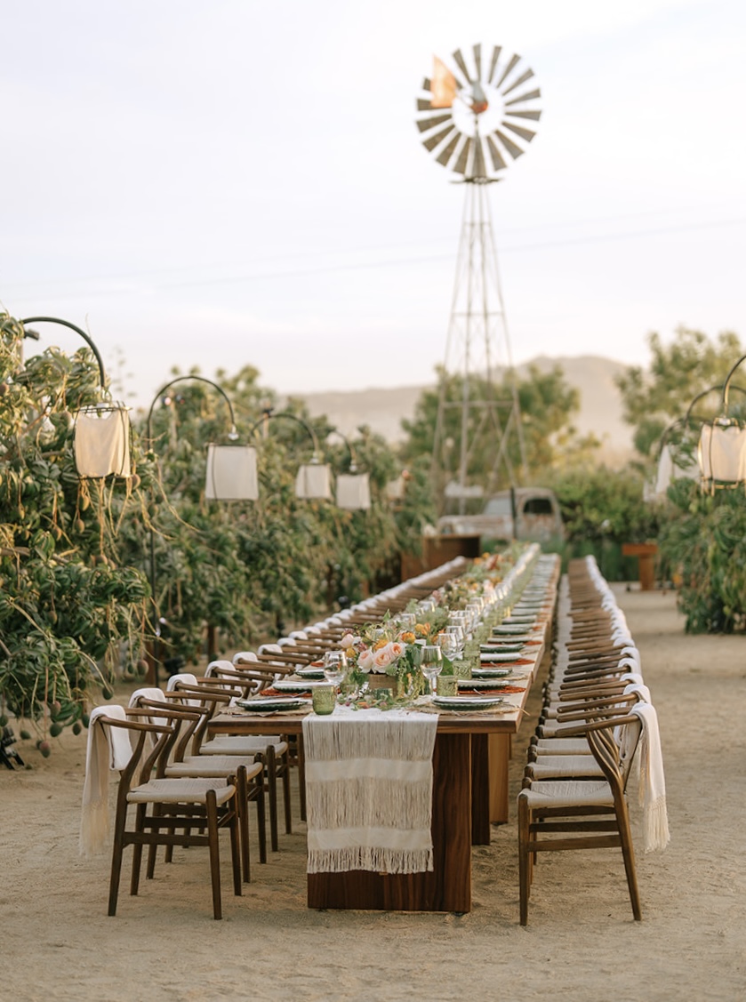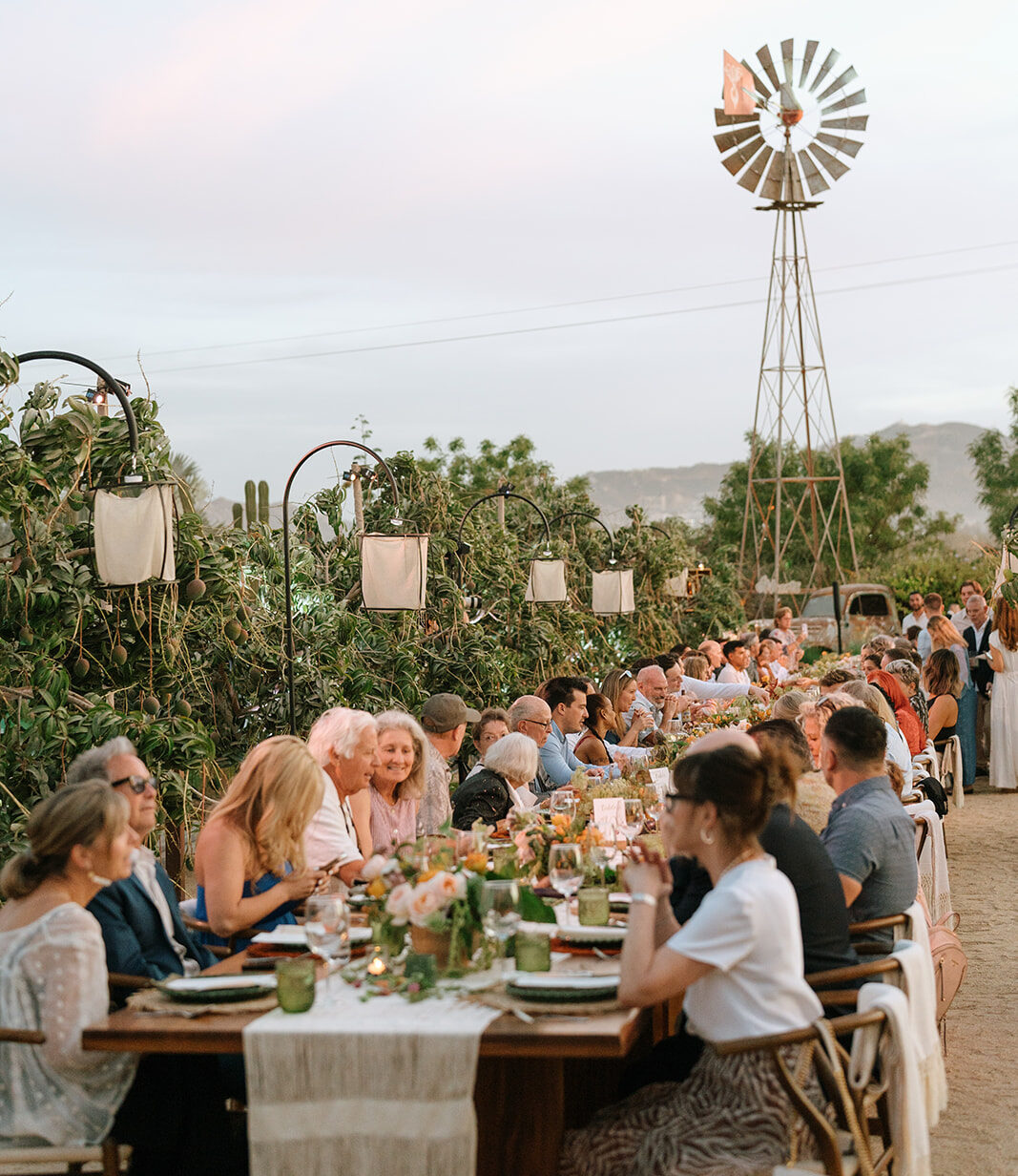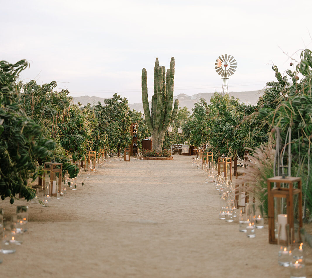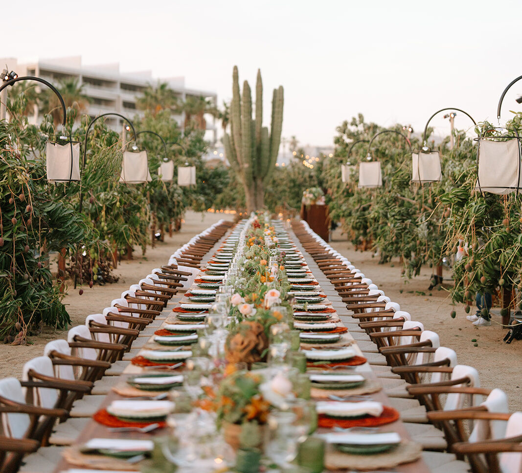 The imperial table stretched like a glowing pathway through cactus, trees, and the iconic mill that watches over the garden. A corridor of nature turned into a stage. Soft textured runners, straw-and-orange chargers, green plates, candlelight guiding the eye. Flowers—crafted in that recognizable Elena style—looked as if they had grown from the land itself. Every detail intentional, every element placed to honor the setting.