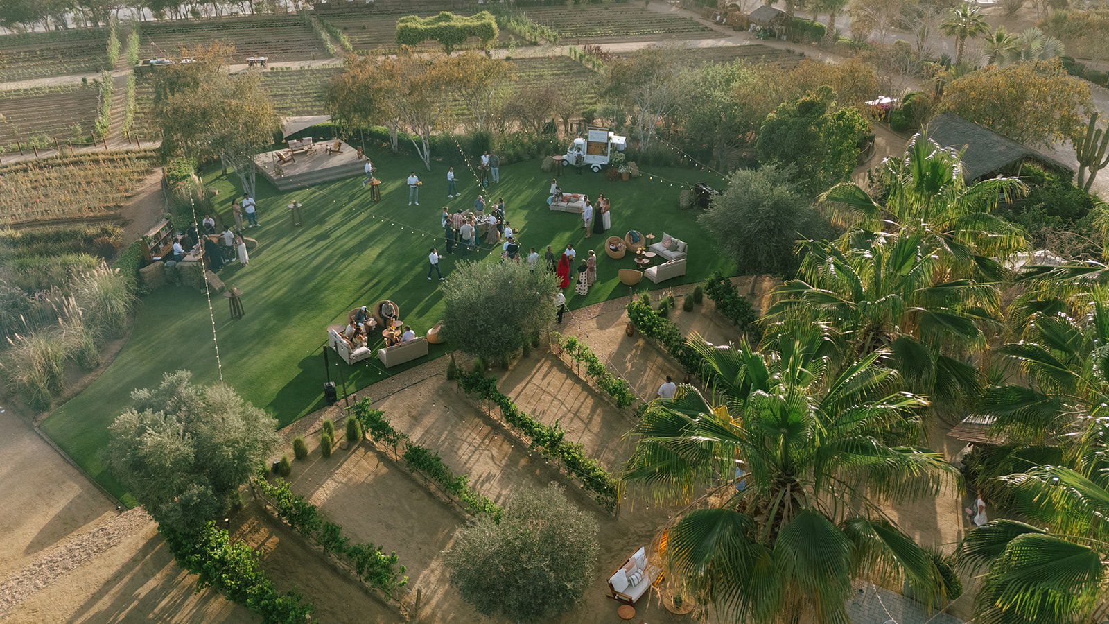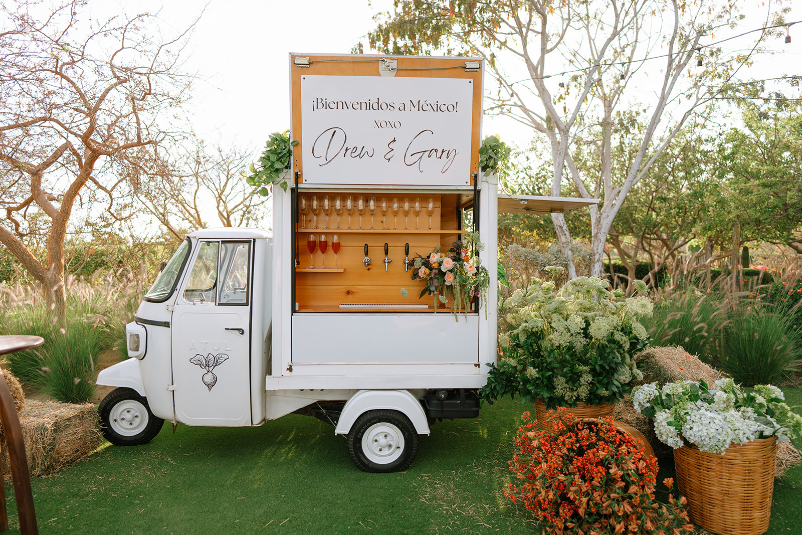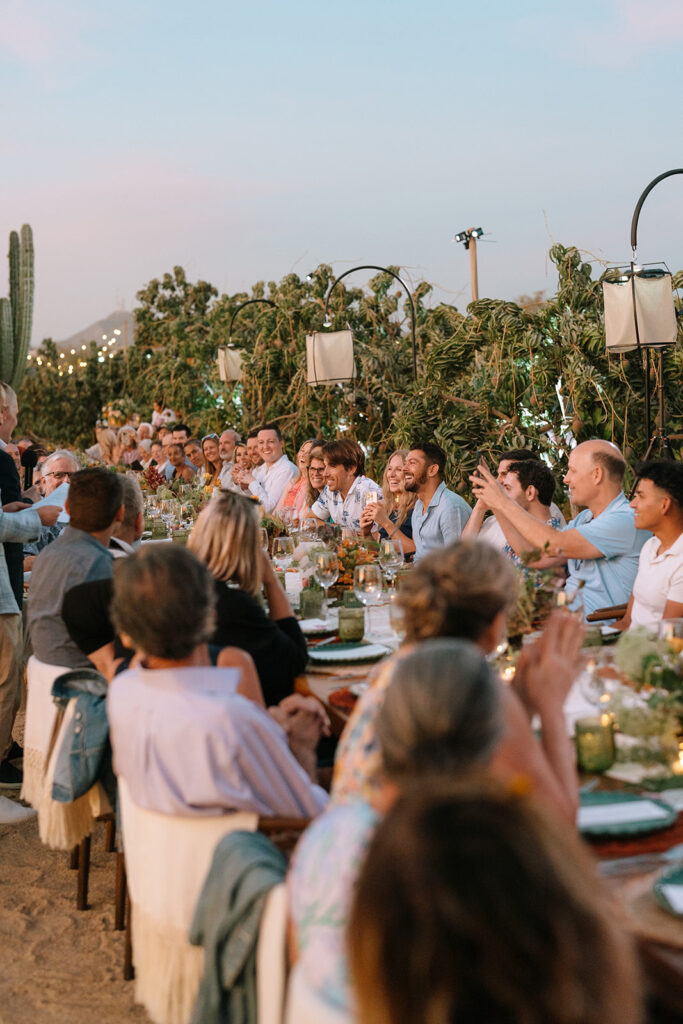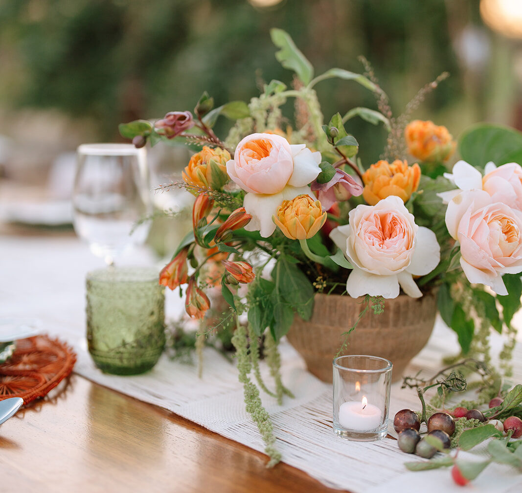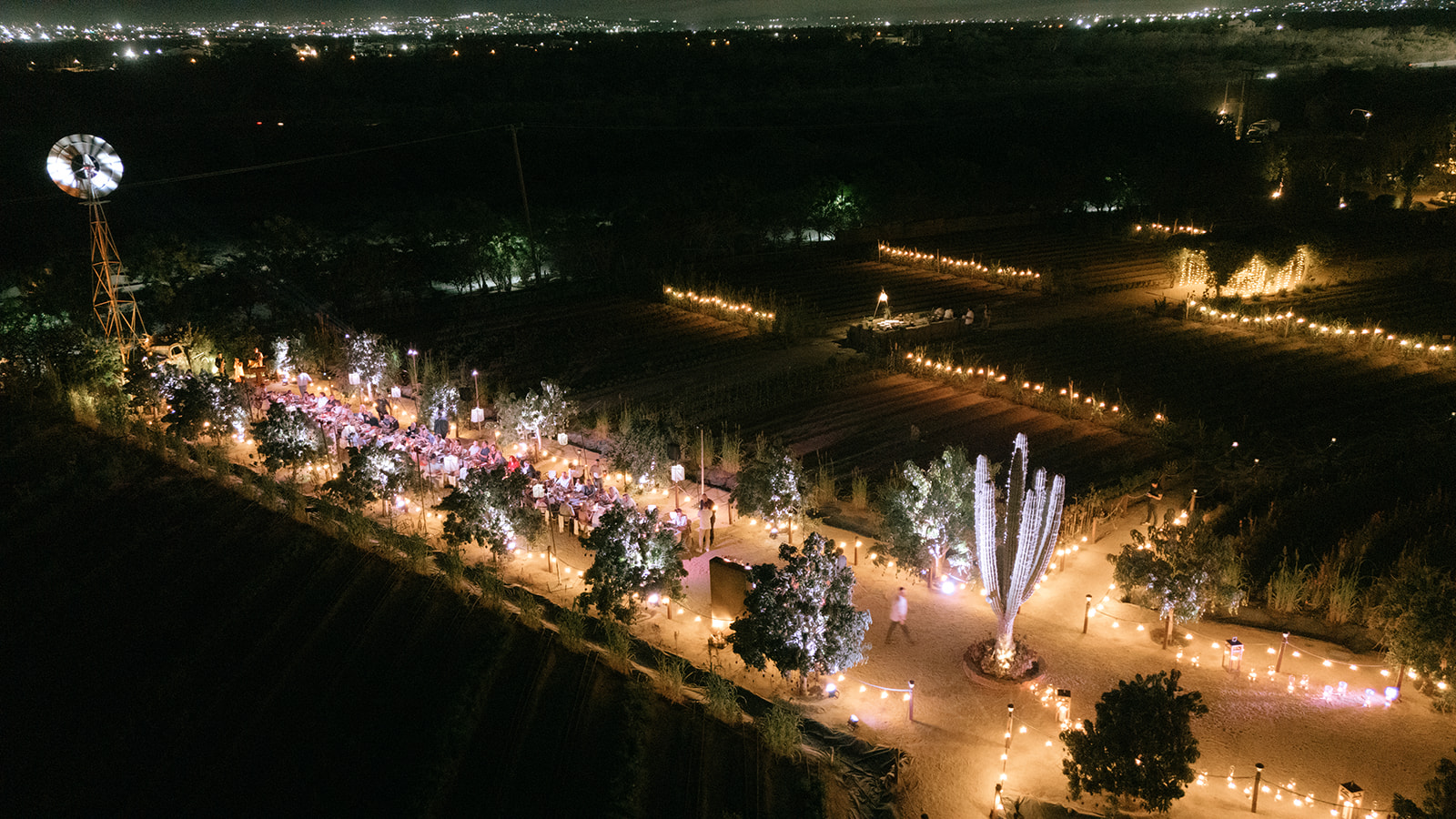 The imperial table stretched like a glowing pathway through cactus, trees, and the iconic mill that watches over the garden. A corridor of nature turned into a stage. Soft textured runners, straw-and-orange chargers, green plates, candlelight guiding the eye. Flowers—crafted in that recognizable Elena style—looked as if they had grown from the land itself. Every detail intentional, every element placed to honor the setting.