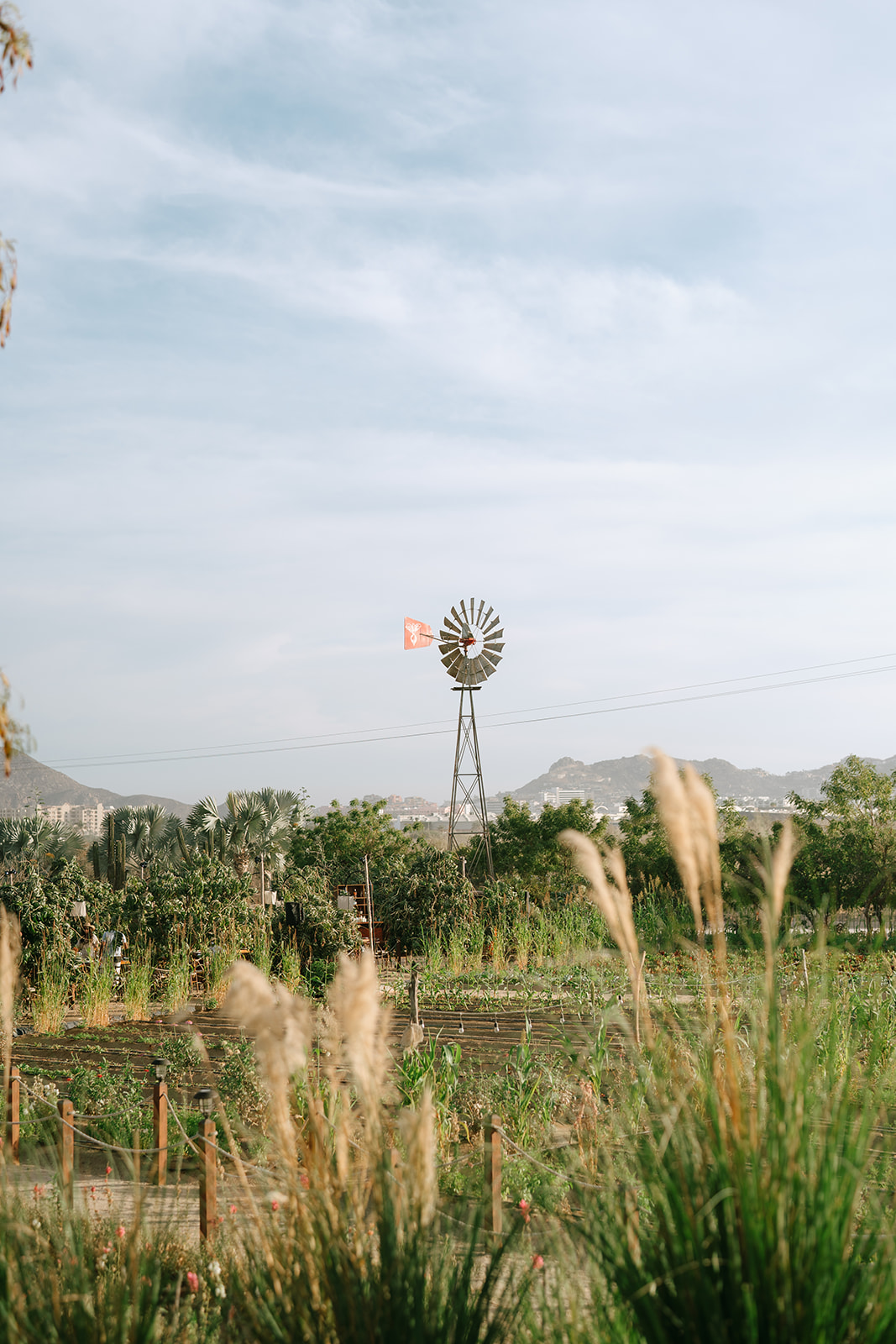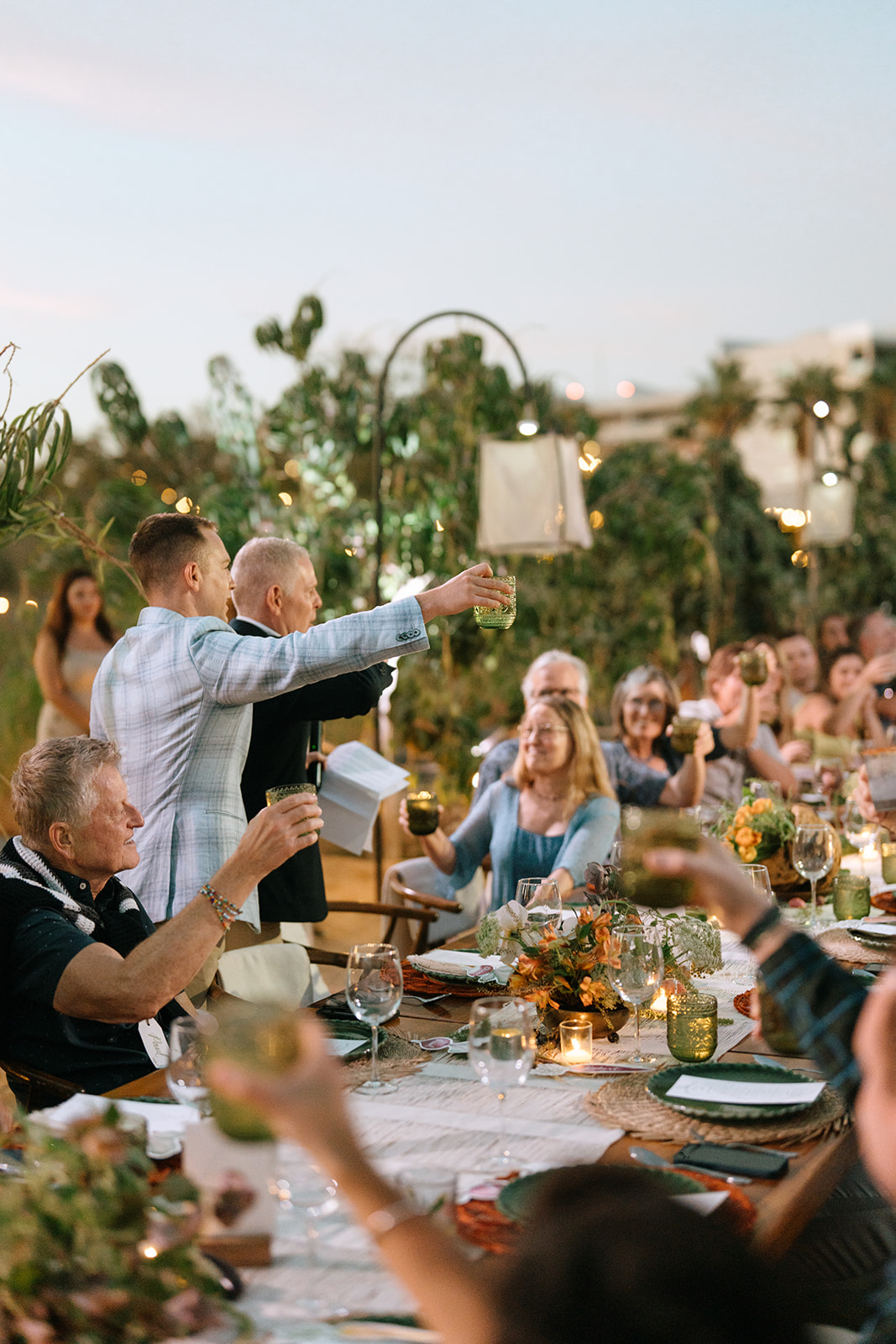 The imperial table stretched like a glowing pathway through cactus, trees, and the iconic mill that watches over the garden. A corridor of nature turned into a stage. Soft textured runners, straw-and-orange chargers, green plates, candlelight guiding the eye. Flowers—crafted in that recognizable Elena style—looked as if they had grown from the land itself. Every detail intentional, every element placed to honor the setting.