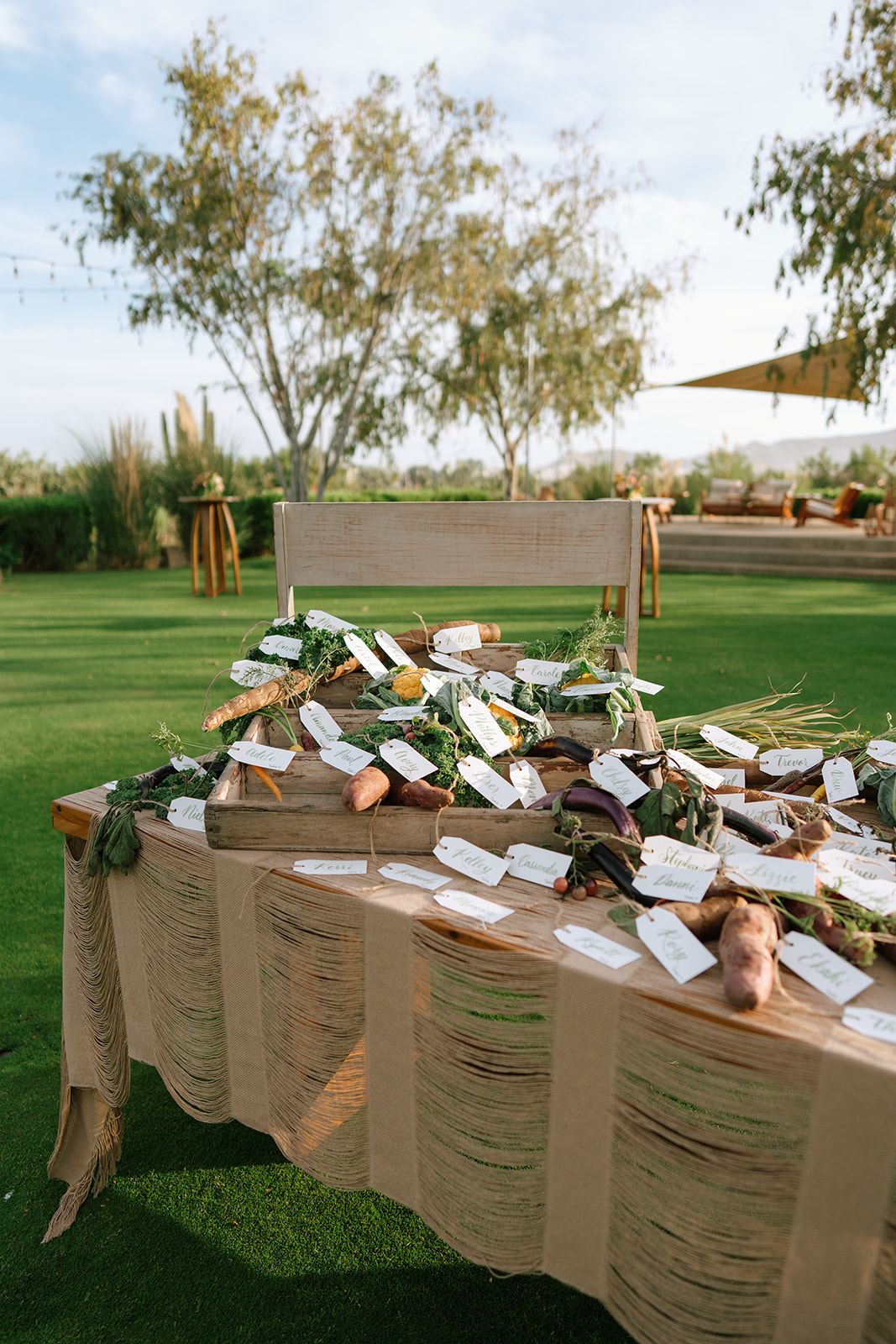 Even the seating chart became a moment: real vegetables on a rustic board, names scattered playfully among them. A thoughtful farm-to-table nod that felt fresh, surprising, and still incredibly elegant.