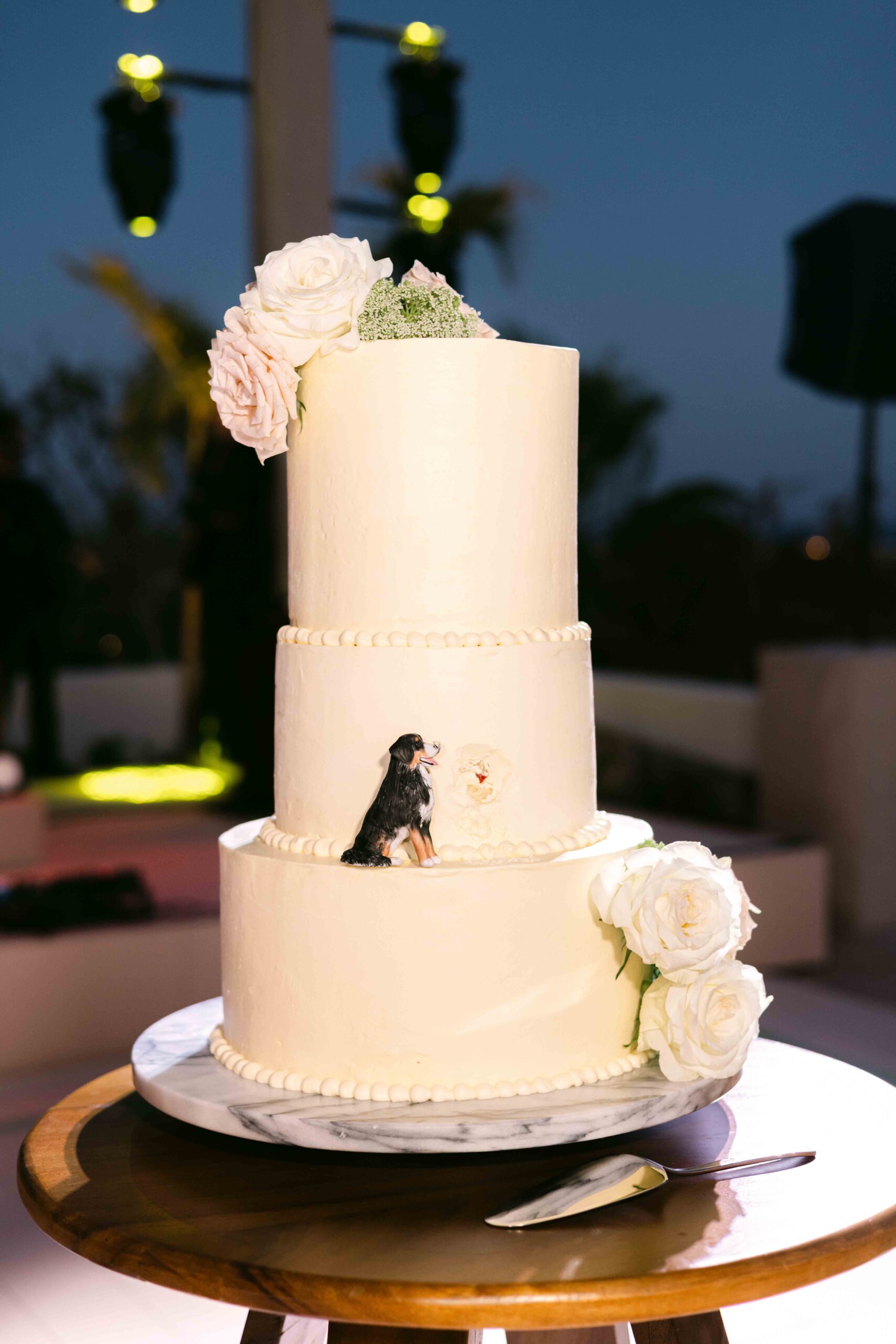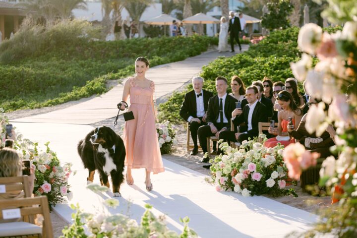 Down by the beach, their ceremony was a dream. A chuppah draped in greenery, white roses, and pale pink blooms framed the ocean perfectly—simple, elegant, unforgettable. And just when everyone thought it couldn’t get sweeter, their adorable pup Wally made his entrance, stealing hearts one paw at a time.