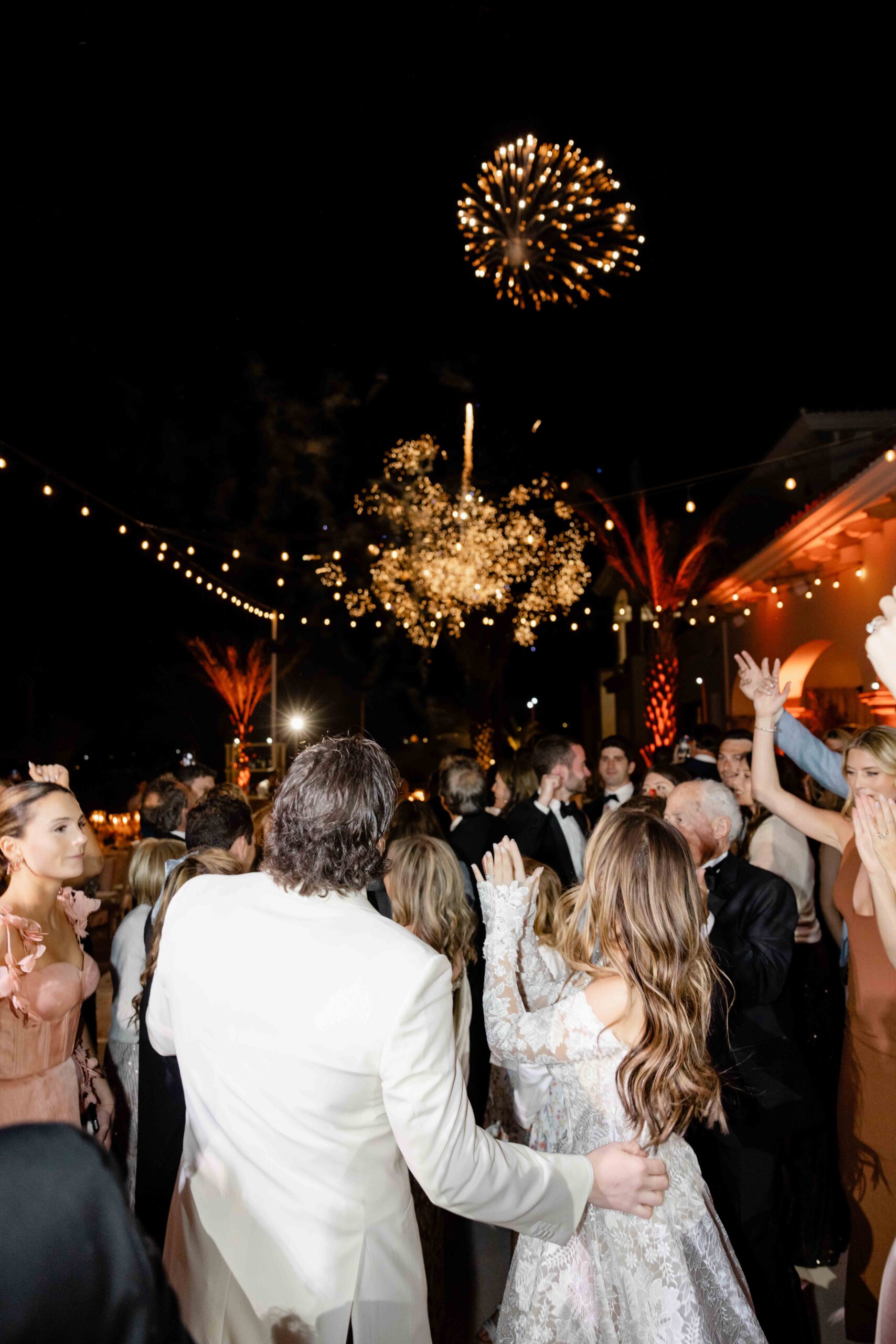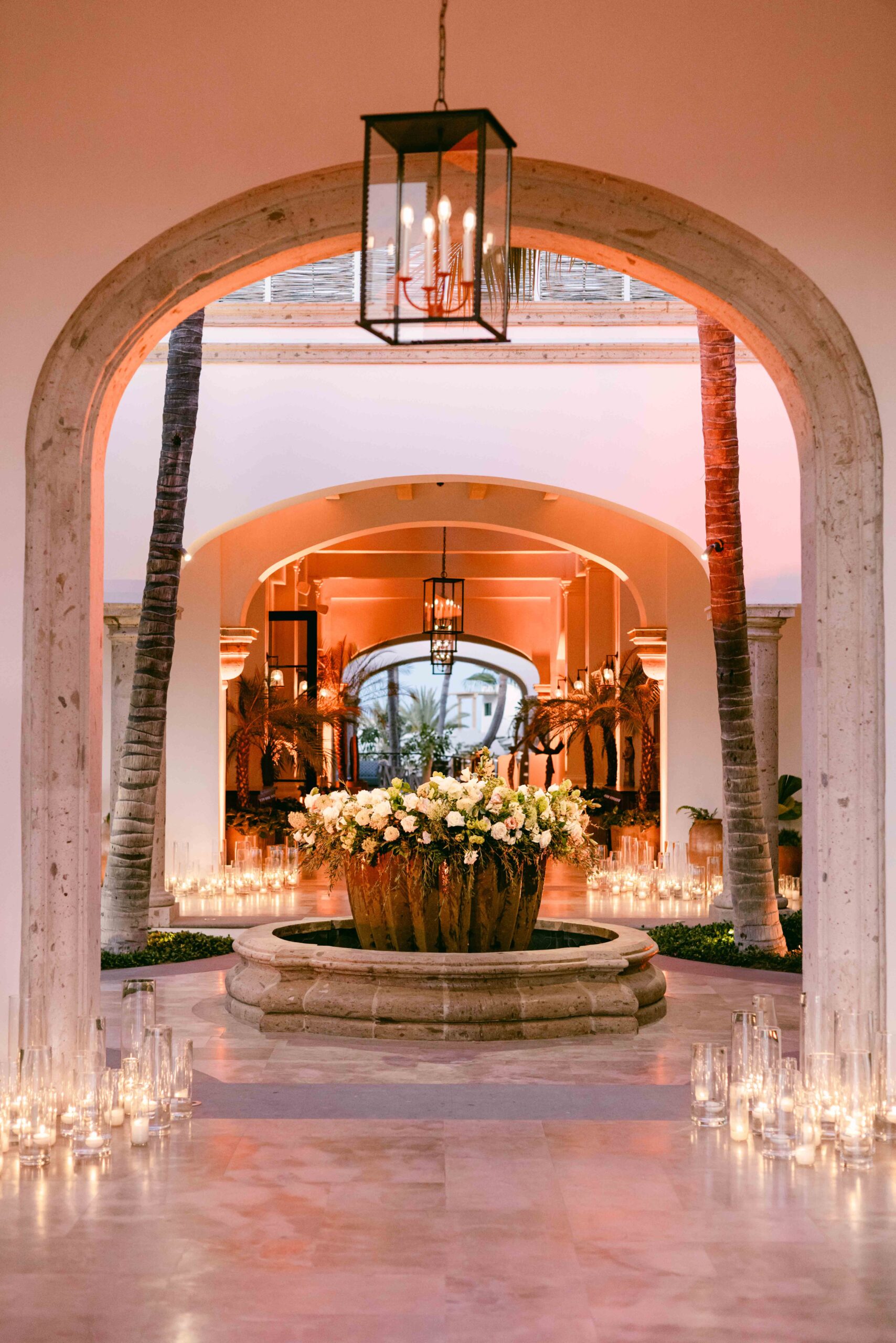 Imagine walking into a wedding greeted by candlelight and the soft scent of roses. That’s exactly the experience we aimed to create for Alexis & Max—an entrance that made every guest stop and say wow. From the fountain covered in flowers to the glowing path that led into Casa del Sol, every detail whispered romance and intention.